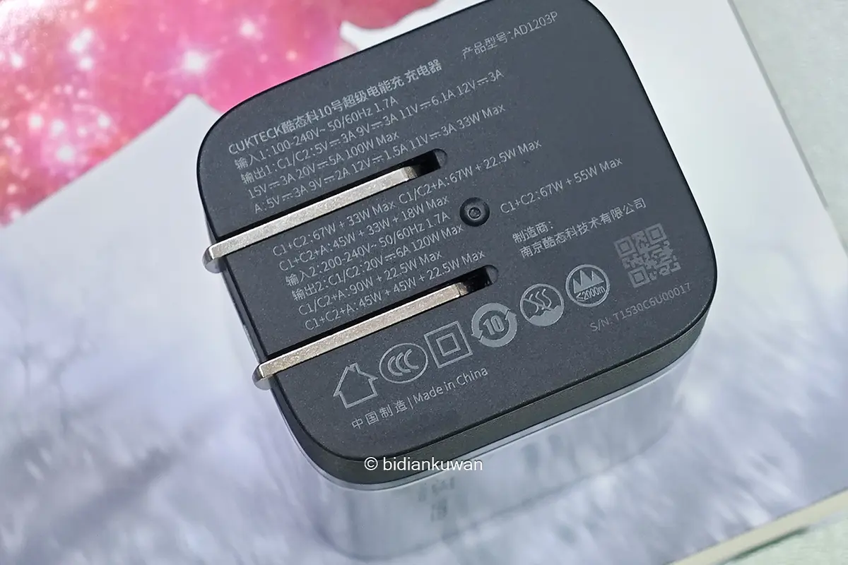 ▲支持全球电压,200~240V 50/60Hz下,单C1/C2可以输出最高120W,C1+C2可以输出67W+55W Max,C1或C2+A双口输出90W+22.5W Max;三口同时输出可以达到45W+45W+22.5W Max。