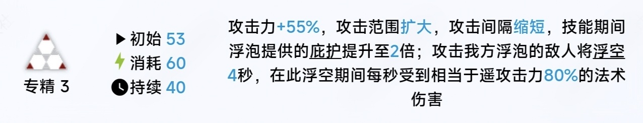 浮光泡影:每过一个攻击间隔,使范围内一名友方单位获得30%底护的浮泡,浮泡在受到做方伤害的短暂延迟后破碎。