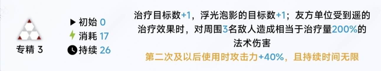 扶摇花火:浮泡破碎时,为所在的单位治疗相当于遥攻击力28%(+3%)的生命值。