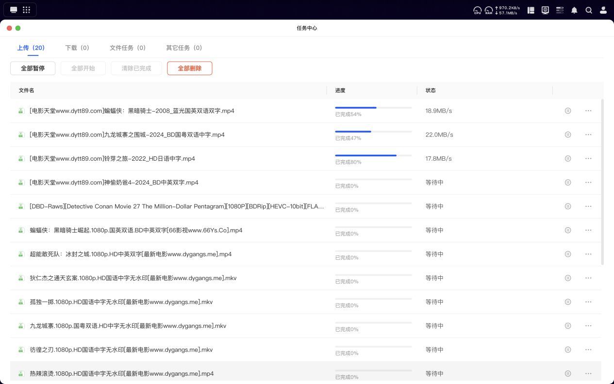 在实际测试里,当用MacBook Pro笔记本往绿联DH4300 Plus上传电影时,即便同时开启三项上传任务,每项任务的速度峰值仍能达到 24 MB/s。要知道,这台NAS配备的是千兆网络接口,而笔记本是通过WiFi 6进行无线连接的,这样的传输表现与实际使用场景的性能预期完全匹配,整体效率让人挑不出毛病。