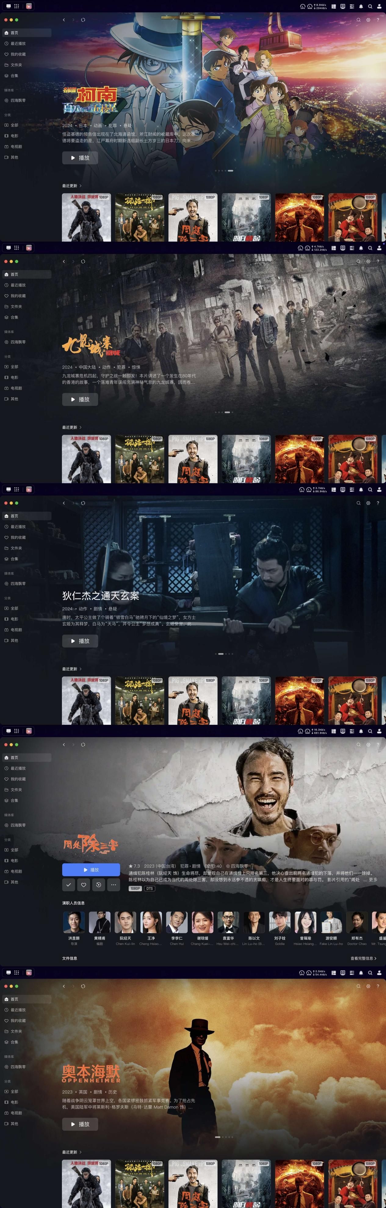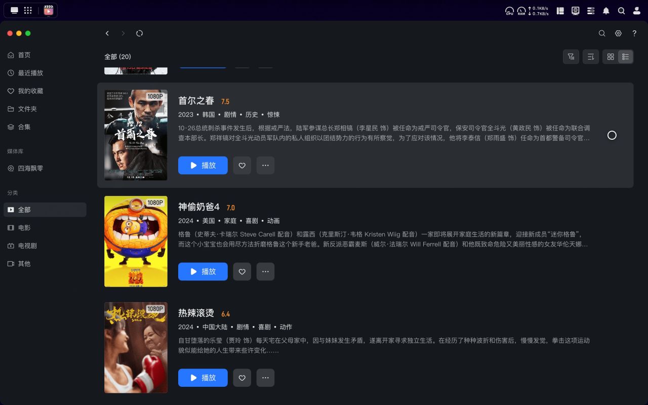 实测上传的电影文件都能自动匹配海报,还可以实现智能海报墙展示,集成资源管理功能,支持本地最高4K无损视频播放,观影全程无广告打扰。