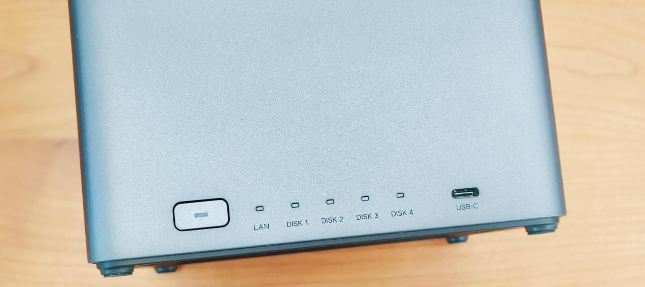绿联DH4300 Plus NAS在外观设计上呈现出方正而不失圆润的造型,整体线条简洁利落。在机身下方区域有一个电源按键,旁边则是一组排列整齐的LED状态指示灯,便于用户随时掌握设备运行情况。此外,设备还配备了一个USB-C接口,方便连接外部设备或进行数据传输。