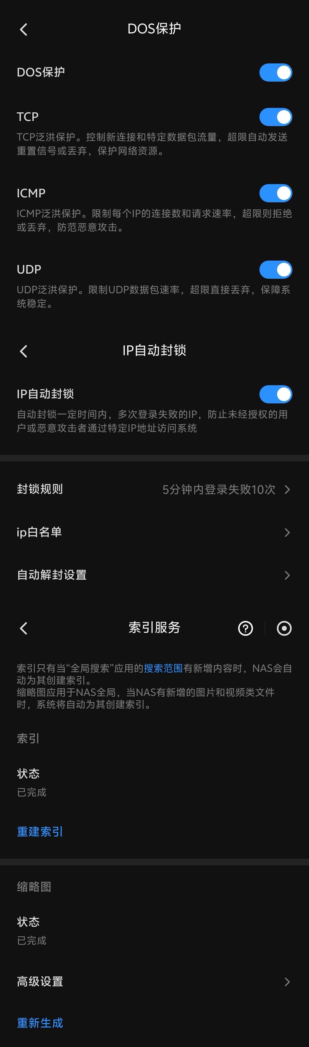 在安全防护方面,绿联可谓是细致周到,不仅配备了防御DOS攻击的机制,还具备IP自动封锁和索引服务等多项保护功能,全面保障系统的稳定与安全。