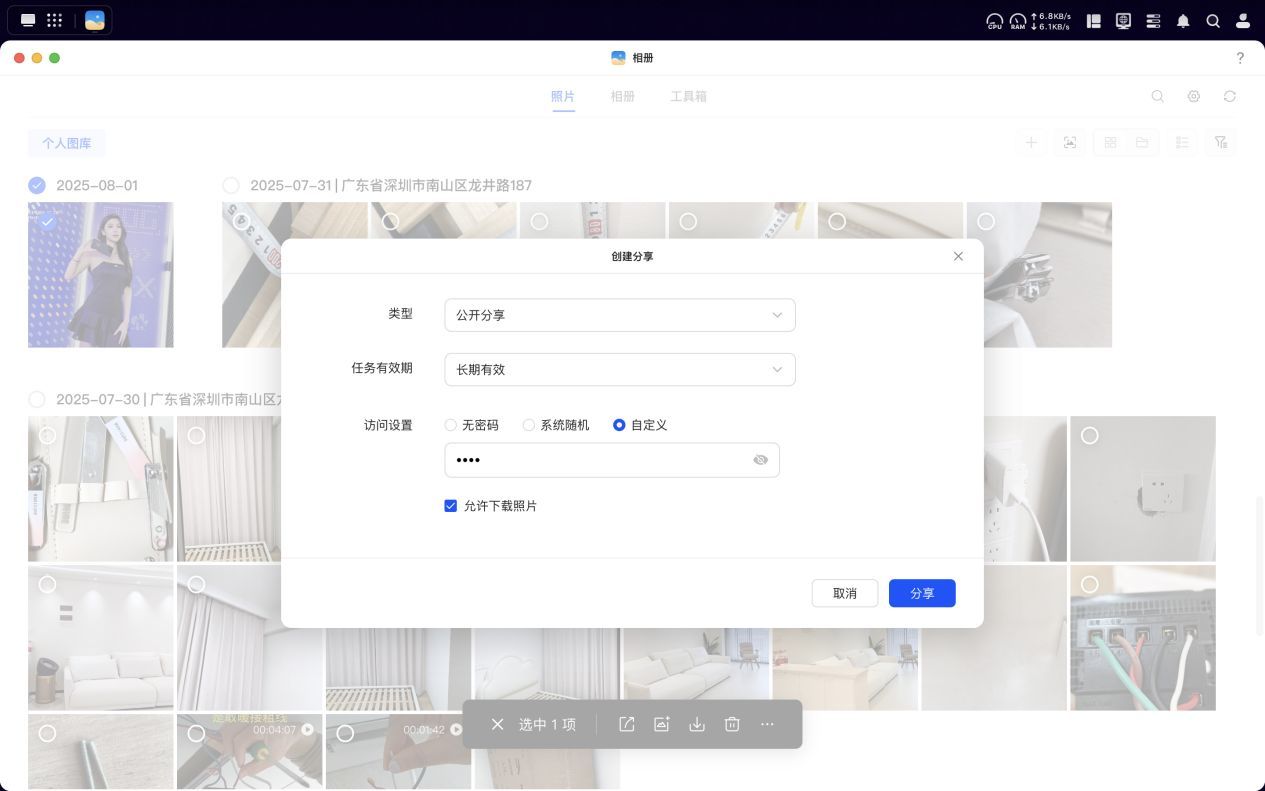此外还支持家庭成员间的便捷共享,除了在站内可以单独设置条件相册外,有对外分享需求的时候还可以带权限生成外链,对方直接点击链接就能直接查看,方便快捷,还不用担心隐私泄露。