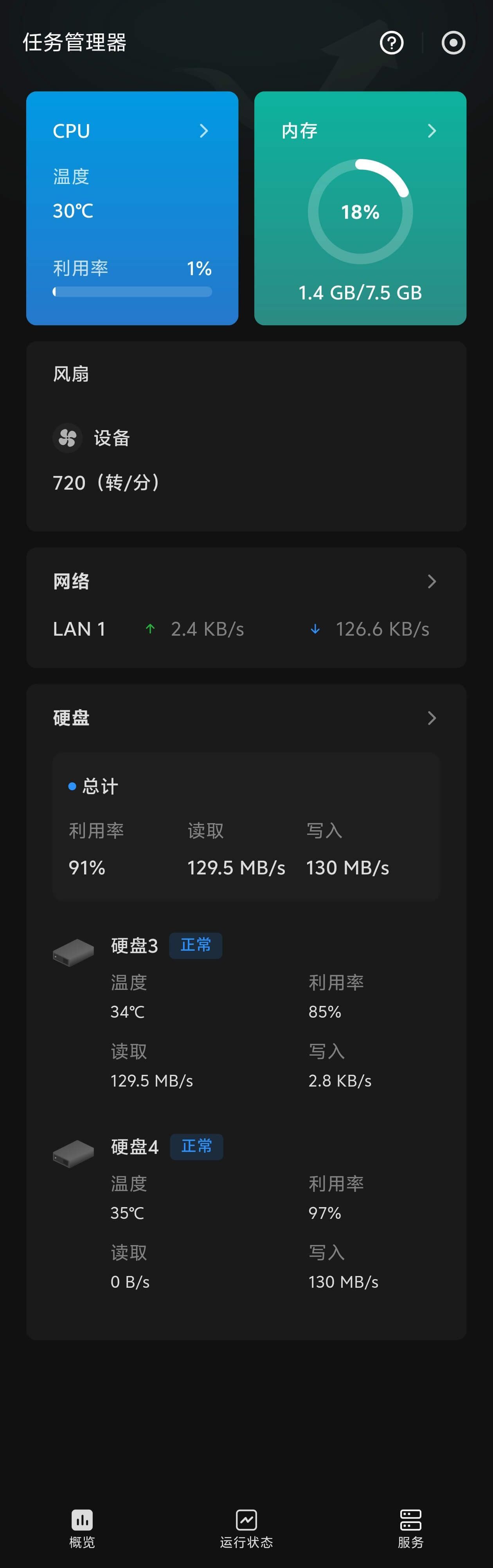 通过任务管理器可以查看当前系统的运行情况。目前CPU温度大约为30℃,运行负荷处于较低水平,性能利用率不高。同时,8GB的板载内存中仅使用了1.4GB,内存占用率仅为18%。网络连接和硬盘运行状态也均显示正常。