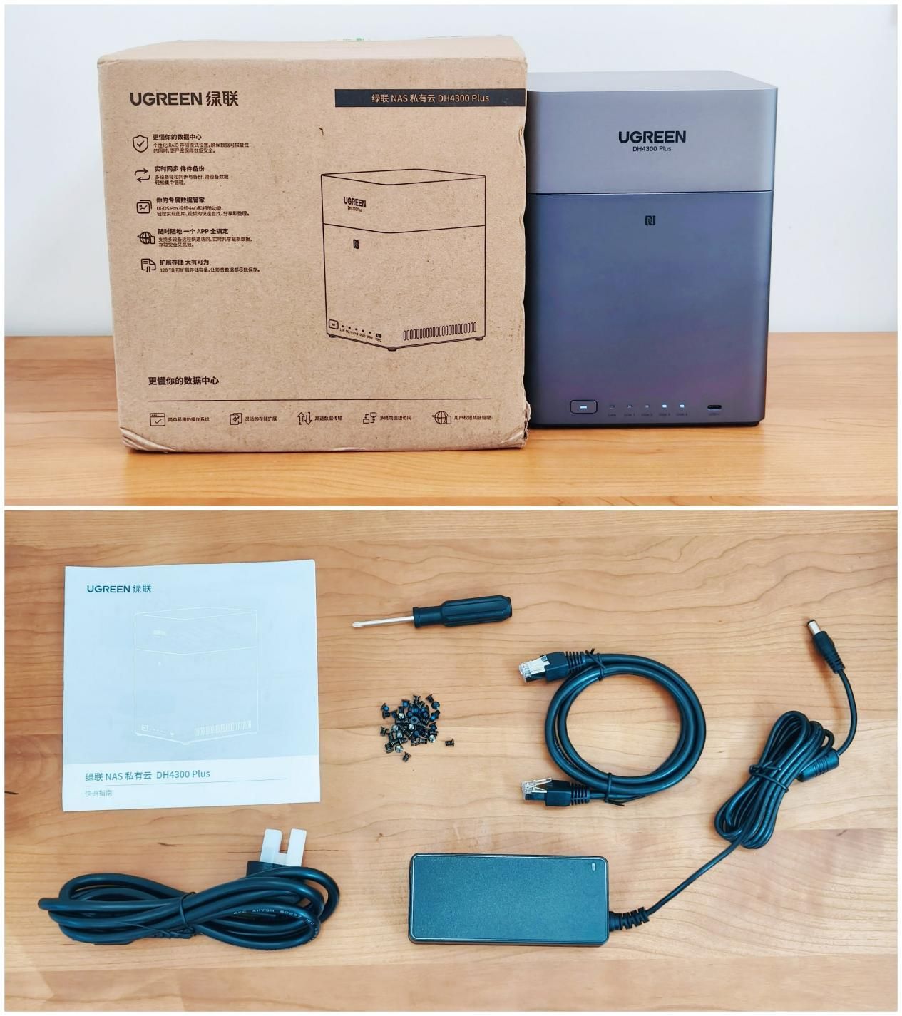 如今正值国家补贴活动期间,绿联NAS的性价比也因此更加突出。对于新手用户来说,建议优先考虑选购搭配大容量机械硬盘的捆绑套装,这样的组合不仅更加经济实惠,也省去了后期单独购买硬盘的额外开销。毕竟,大容量硬盘单独购置的价格并不低廉,而套装形式往往能带来更大的价值。先从绿联DH4300 Plus的配件部分开始了解吧。开箱可以看到包装内包含一份快速入门说明书、一个十字螺丝刀、两包用于固定硬盘的螺丝、一根RJ45网线、一根电源延长线,以及一个电源适配器。这些配件在日常使用中完全能够满足基本需求,实用性得到了充分保障。
