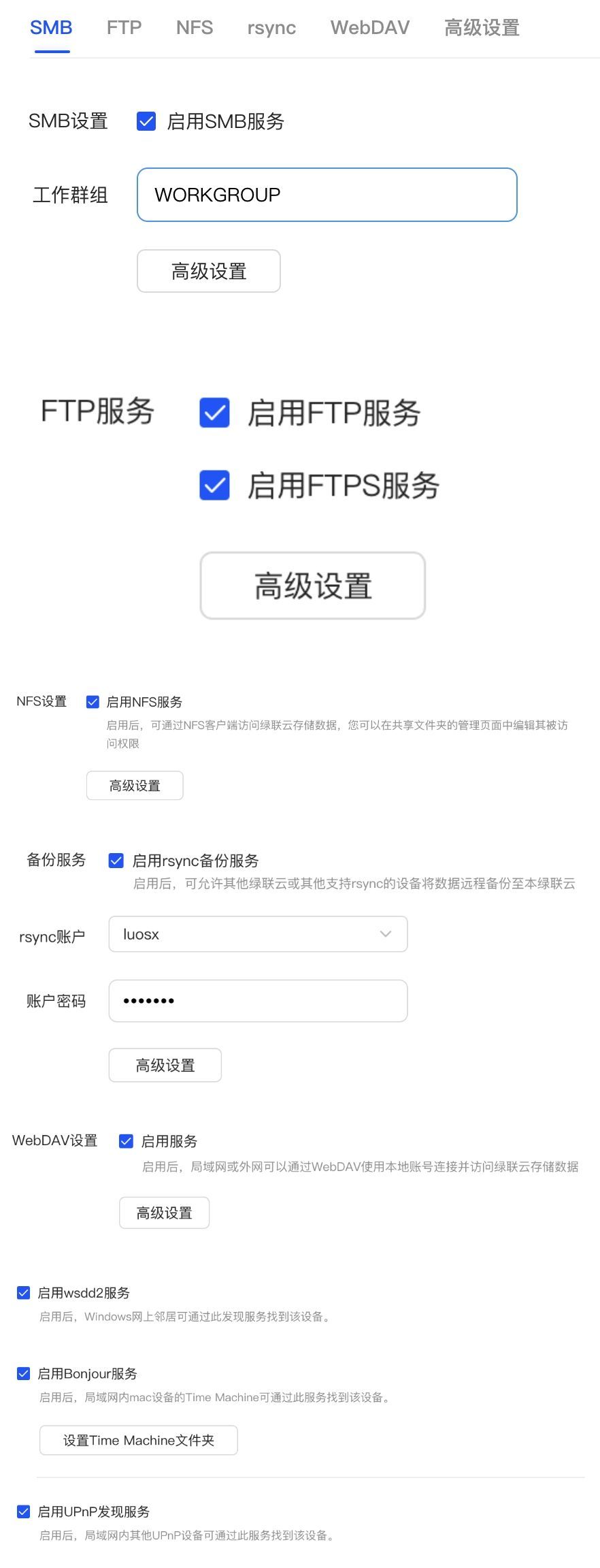 绿联UGOS Pro系统具备广泛的协议兼容性,支持包括Samba、AFP、NFS、WebDAV、iSCSI、UPnP、Bonjour、wsdd2、rsync多种网络协议,满足多样化设备连接与数据传输需求。针对不同的需求可以用不同的协议进行部署,SMB可用于本地挂载存储视频以进行本地剪辑,iSCSI则更适合作为游戏存储盘使用。