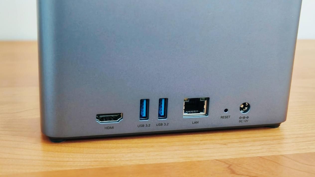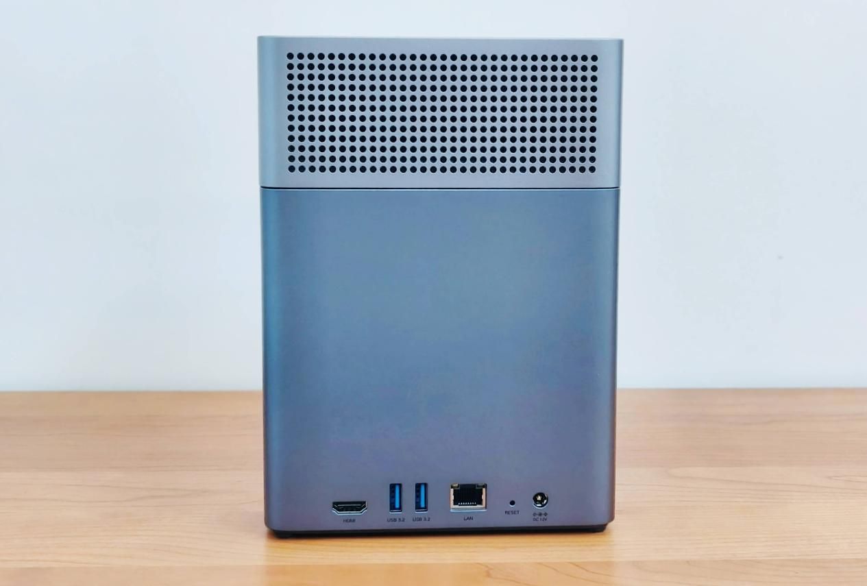 当然,在绿联DH4300 Plus NAS机身后部的上方也设计有用于机械硬盘散热的通风孔。在下方的I/O接口区域,则配备了丰富的接口,包括:一个HDMI接口、两个USB 3.2接口、一个2.5 GbE局域网接口、一个RESET重置键以及一个电源输入口,布局合理,便于各种外设与网络的接入。