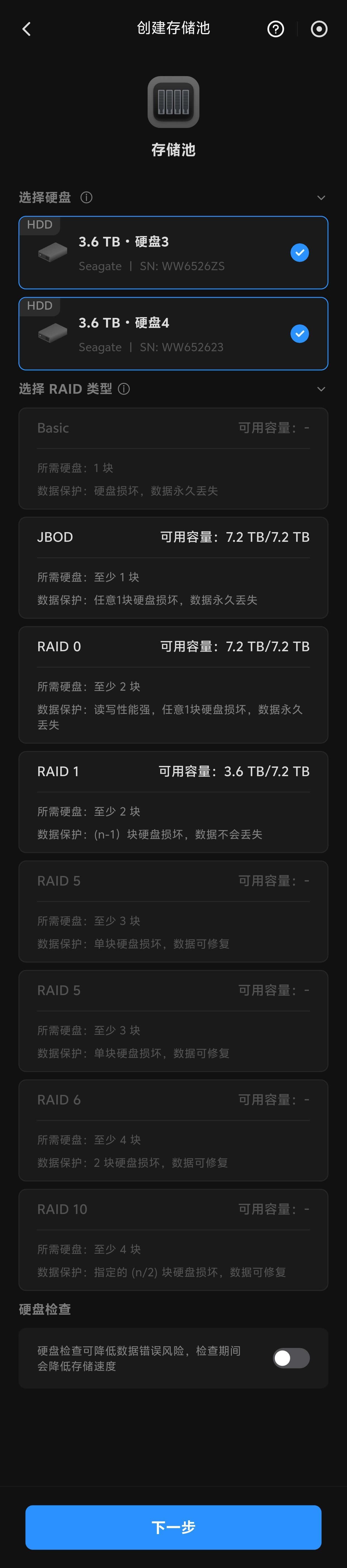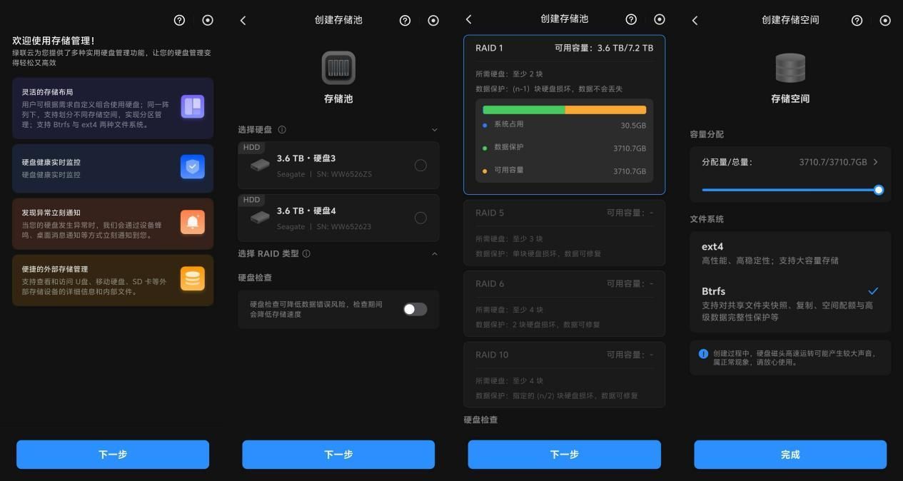 绿联DH4300 Plus允许用户根据需求搭建多种RAID模式以构建存储池。由于四海哥我的手上只有两块4TB硬盘,因此就选择了RAID 1模式,并搭配Btrfs文件系统使用,后者具备支持文件夹快照的功能。