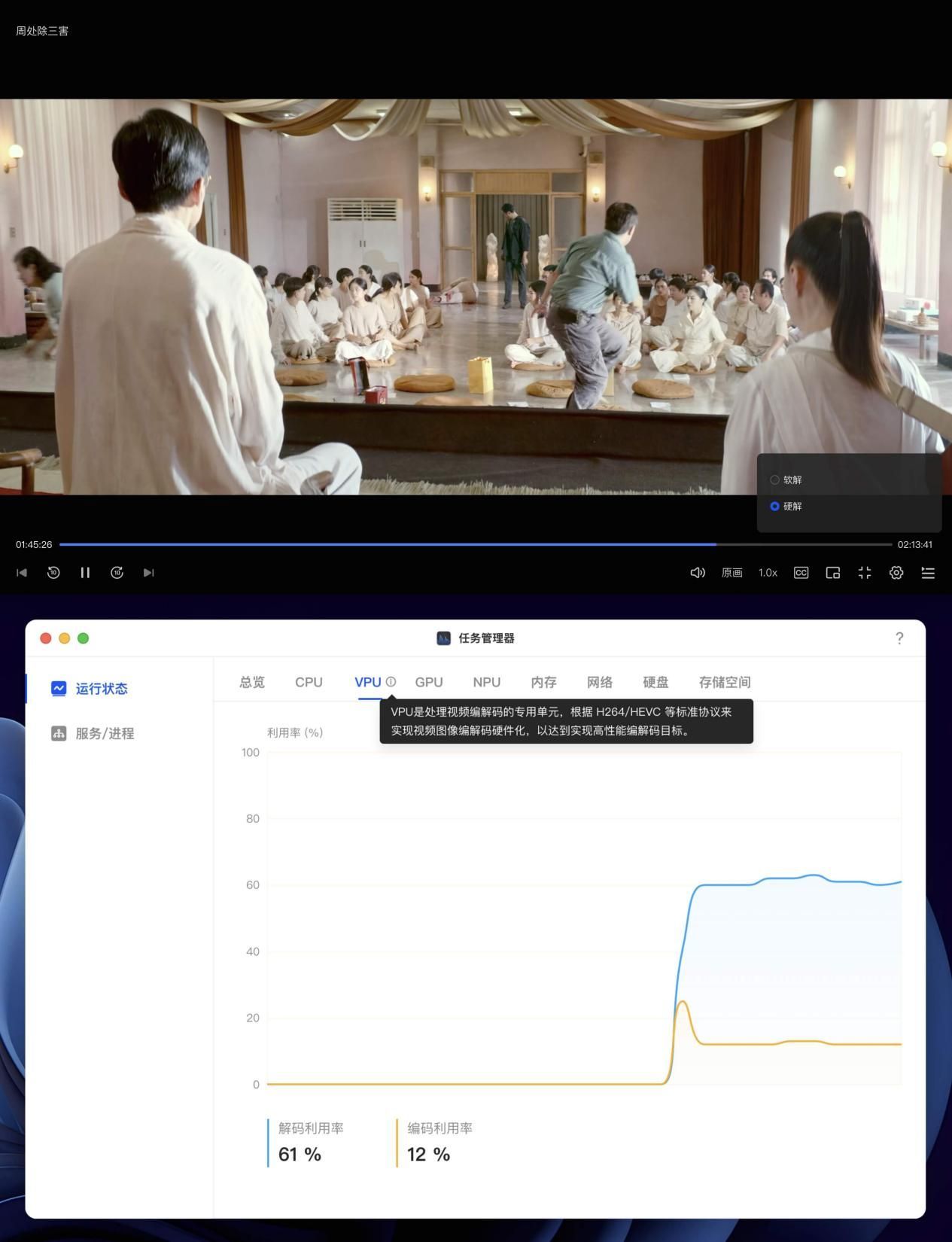 别看绿联DH4300 Plus这款NAS采用的是ARM架构,它的芯片内部可是集成了独立的VPU单元——这是一颗专为视频编解码任务而设计的硬件模块。支持H264与HEVC格式的硬编硬解,有效减轻主处理器的负担。实际测试中,视频解码时的占用率为61%,表现相当出色。对于追求原盘蓝光画质体验的用户而言,这样的配置无疑带来了极大的便利与流畅的观影体验。