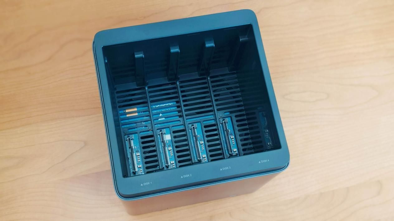 拿下绿联DH4300 Plus的顶盖后,映入眼帘的是位于NAS顶部的四个垂直的硬盘插槽。硬盘支架上清晰标注了从1到4的编号,方便用户识别和安装。