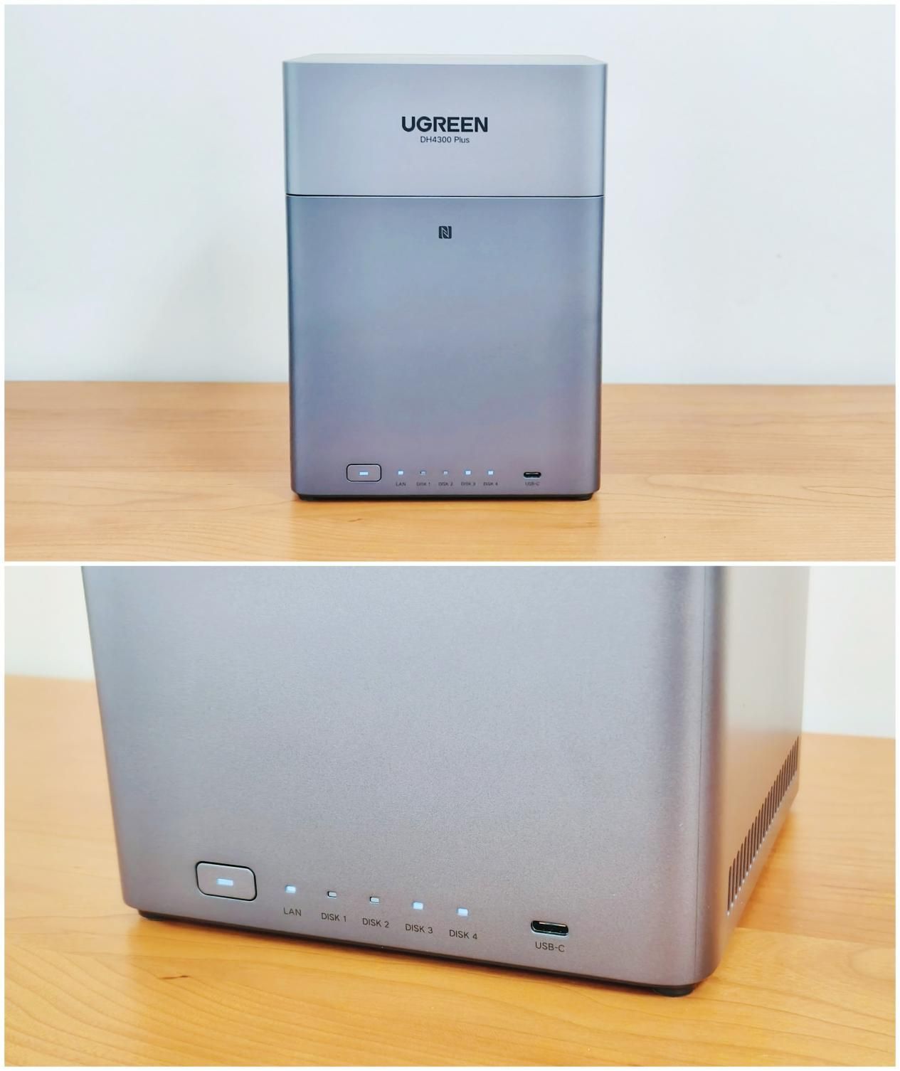 绿联DH4300 Plus延续了品牌一贯的简约风格设计,整体布局清晰直观:一个电源开关键,一个用于指示网络连接状态的LAN口灯,以及四个分别对应硬盘运行状态的DISK指示灯。设备最外侧配备了一个USB-C接口,便于连接移动硬盘、U盘等外部存储设备,操作便捷也很实用。