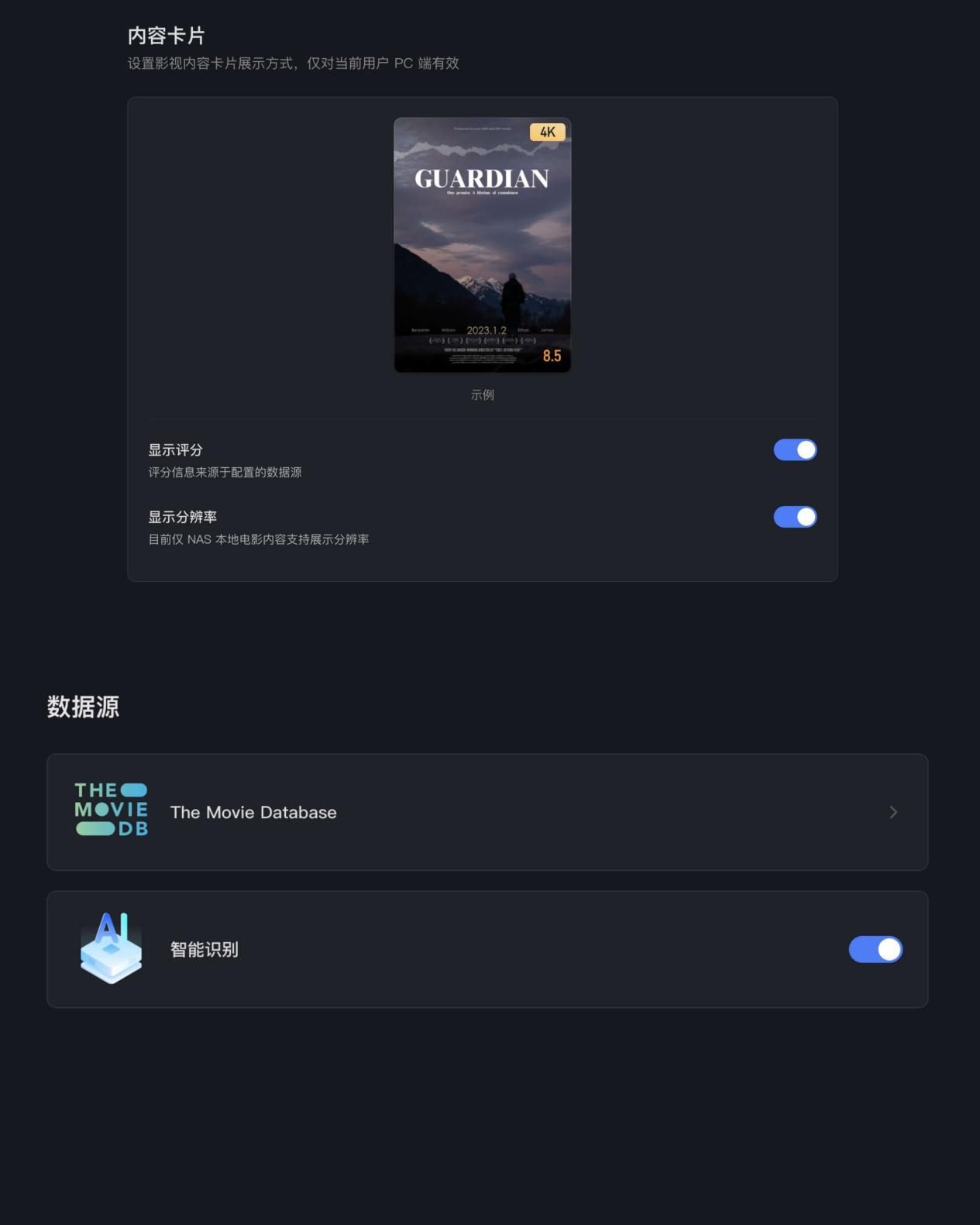 绿联影视中心不仅具备TMDB的影片信息抓取功能,还融合了先进的AI智能识别技术,能够精准展示视频分辨率与电影评分等关键信息,整体表现令人印象深刻,确实值得肯定与推荐。