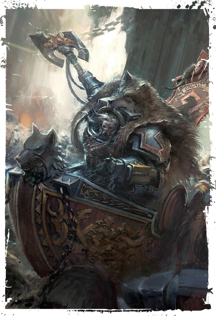 魯斯之影(313.M41):太空野狼在年輕的芬里斯戰士洛根·格里姆納身上窺見非凡潛質。狼祭司追蹤着這位鐵血部落戰士在芬里斯冰海征戰的英姿。當各部落齊聚"海怪之脊"展開血戰時,祭司目睹黎曼·魯斯的虛影縈繞在年輕格里姆納身後。這原體眷顧的明證,促使戰團將這位青年納入傳奇的太空野狼行列。