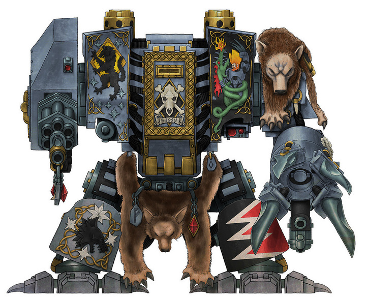狂牙之亂(960.M41)——在死亡世界歐姆尼賽德上,"芬里斯冠軍"大連意外遭遇一臺狂暴的太空野狼無畏機甲正在屠殺混沌星際戰士。經過激戰,這臺殺戮機器被制服並封入靜滯力場,最終被帶回"狼牙堡"研究。