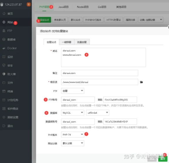 環境已經安裝完成了,讓我們來創建一個網站,這裏我們需要輸入自己的網站域名,把帶www和不帶www的域名全部填寫上,比如http://doraai.com 和 http://www.doraai.com,該步驟就是綁定域名;然後FTP和數據庫最好都創建,將這些信息都記錄下來,以後我們都需要用到的。