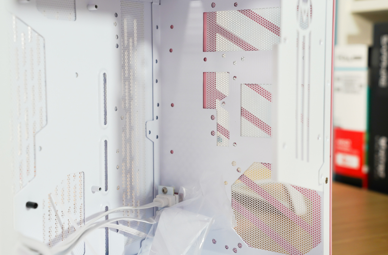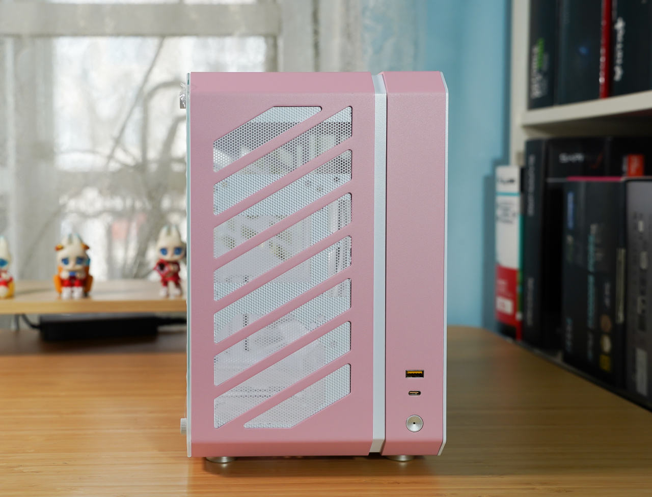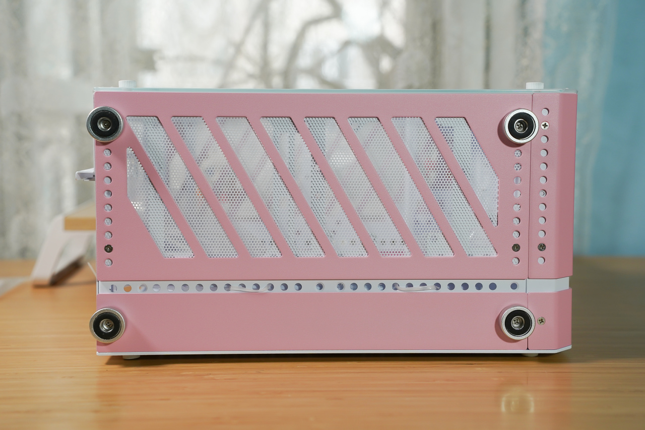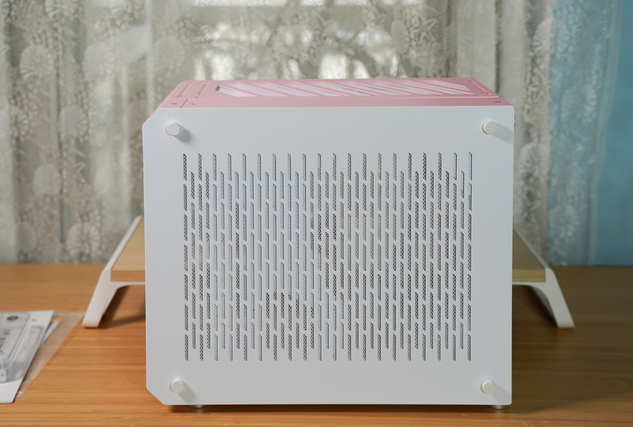 機箱的前臉設計很有特色,雖然是粉色爲主,但伴有很多白色因素,面板右側是IO接口,左側則是有通透的進風設計,白色格柵伴有粉色斜槓,整體看前臉動靜結合,靈動而不呆板,粉色爲主卻不單調,總體看上去很舒適。