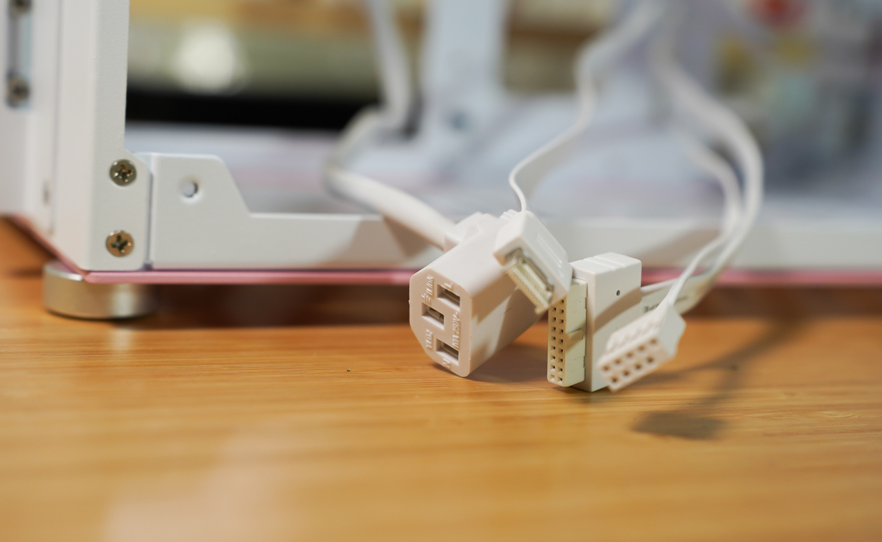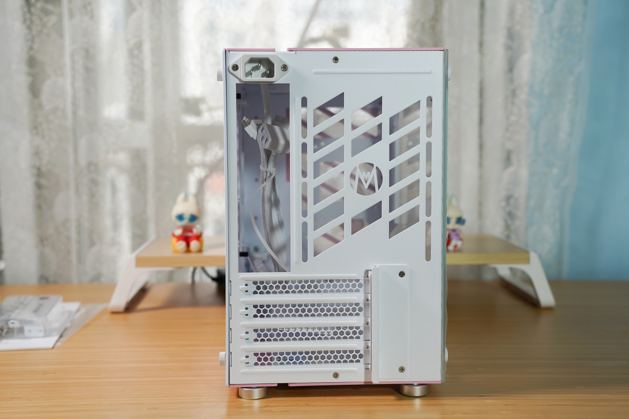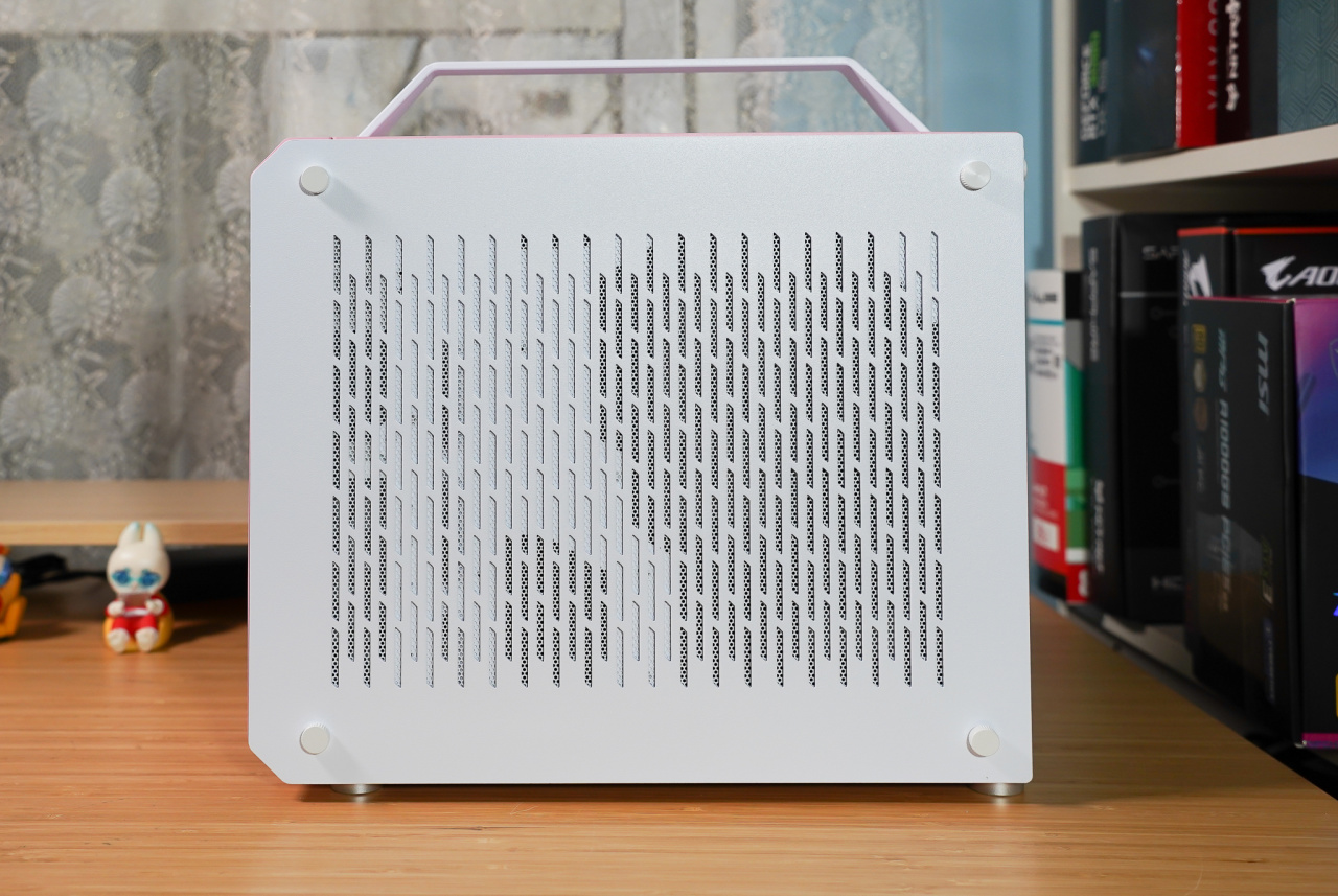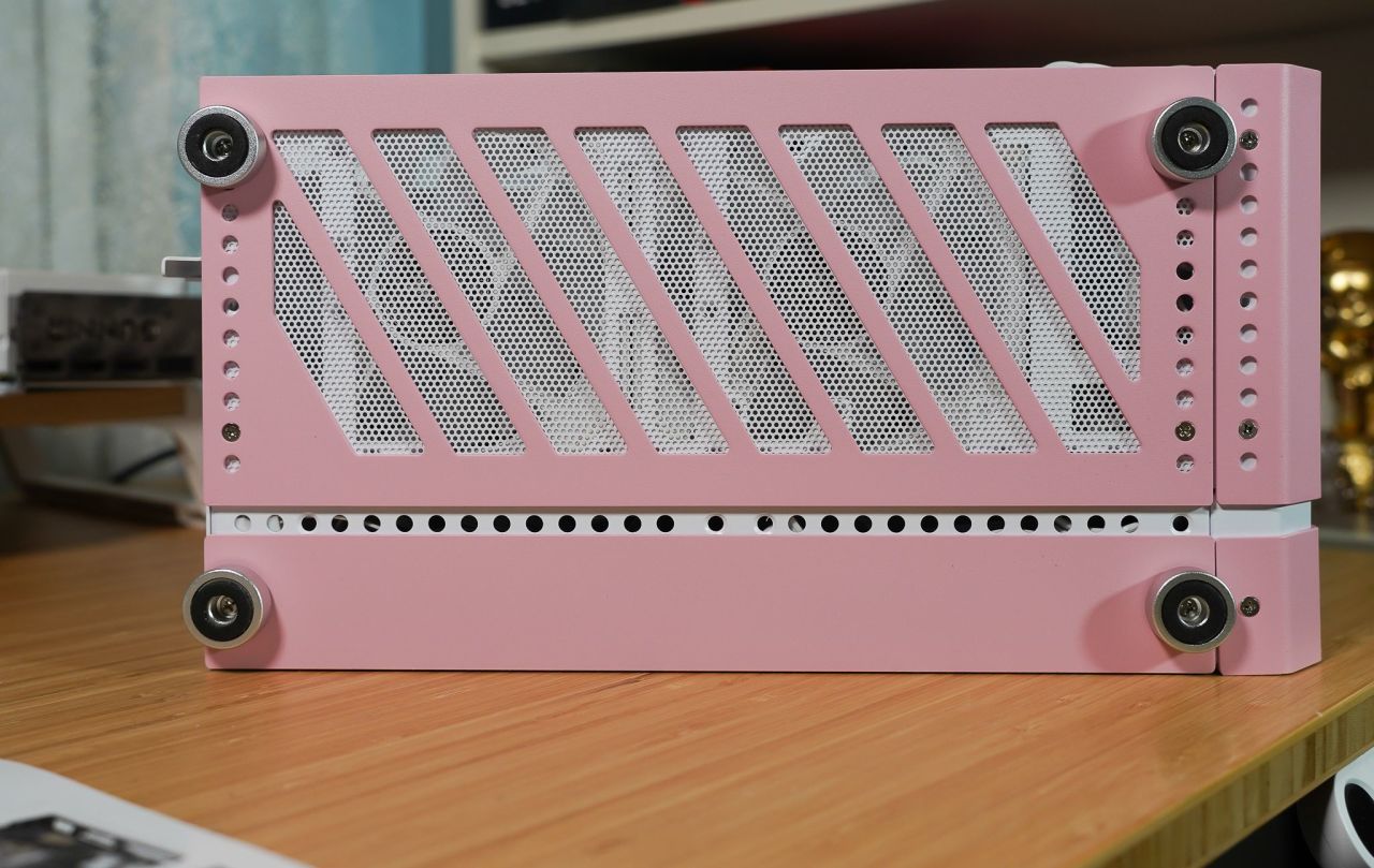 機箱的前臉設計很有特色,雖然是粉色爲主,但伴有很多白色因素,面板右側是IO接口,左側則是有通透的進風設計,白色格柵伴有粉色斜槓,整體看前臉動靜結合,靈動而不呆板,粉色爲主卻不單調,總體看上去很舒適。