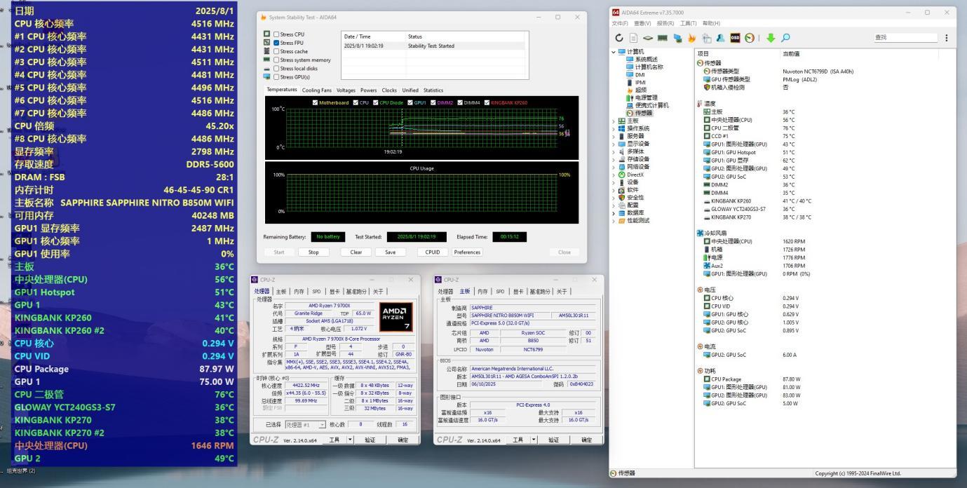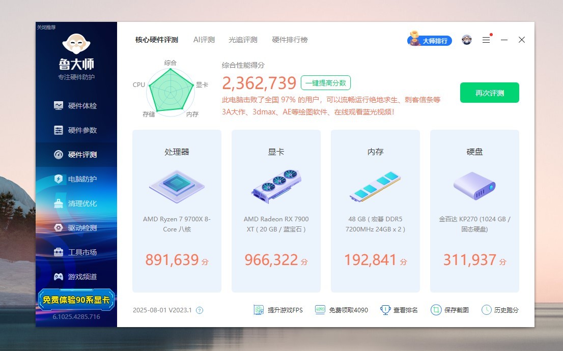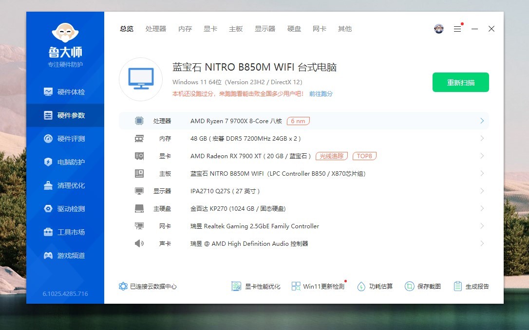 我們看CPU是AMD R7 9700X,內存是宏碁DDR5 7200MHz,顯卡是藍寶石 RX 7900 XT極地版,主板是藍寶石NITRO+ B850M WIFI氮動,硬盤是金百達KP270。