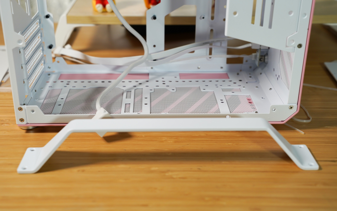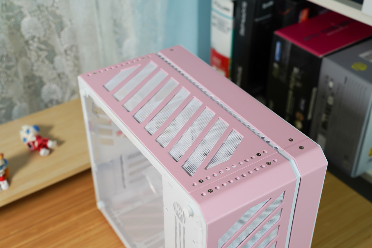 機箱的頂部設計同前臉類似的風格,粉色爲主,白色的條紋爲輔。