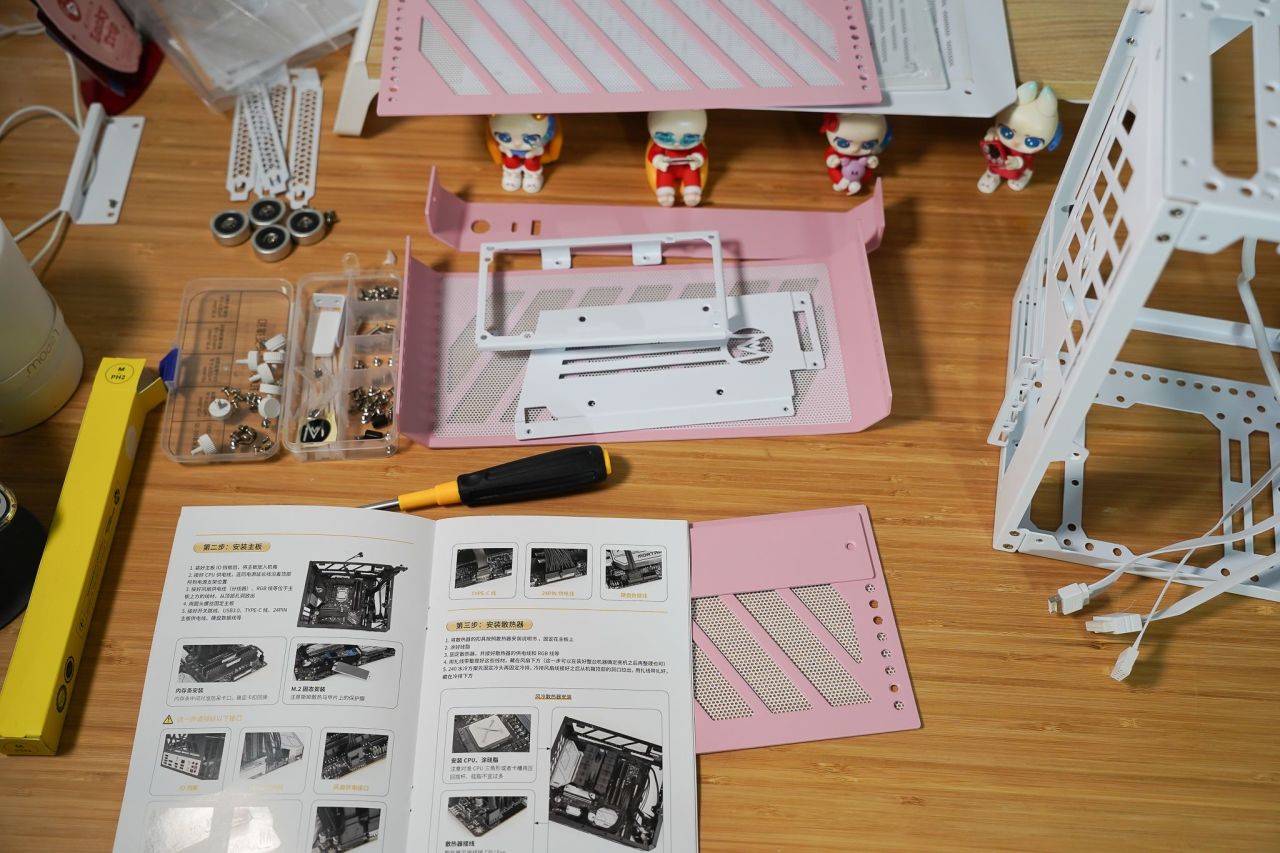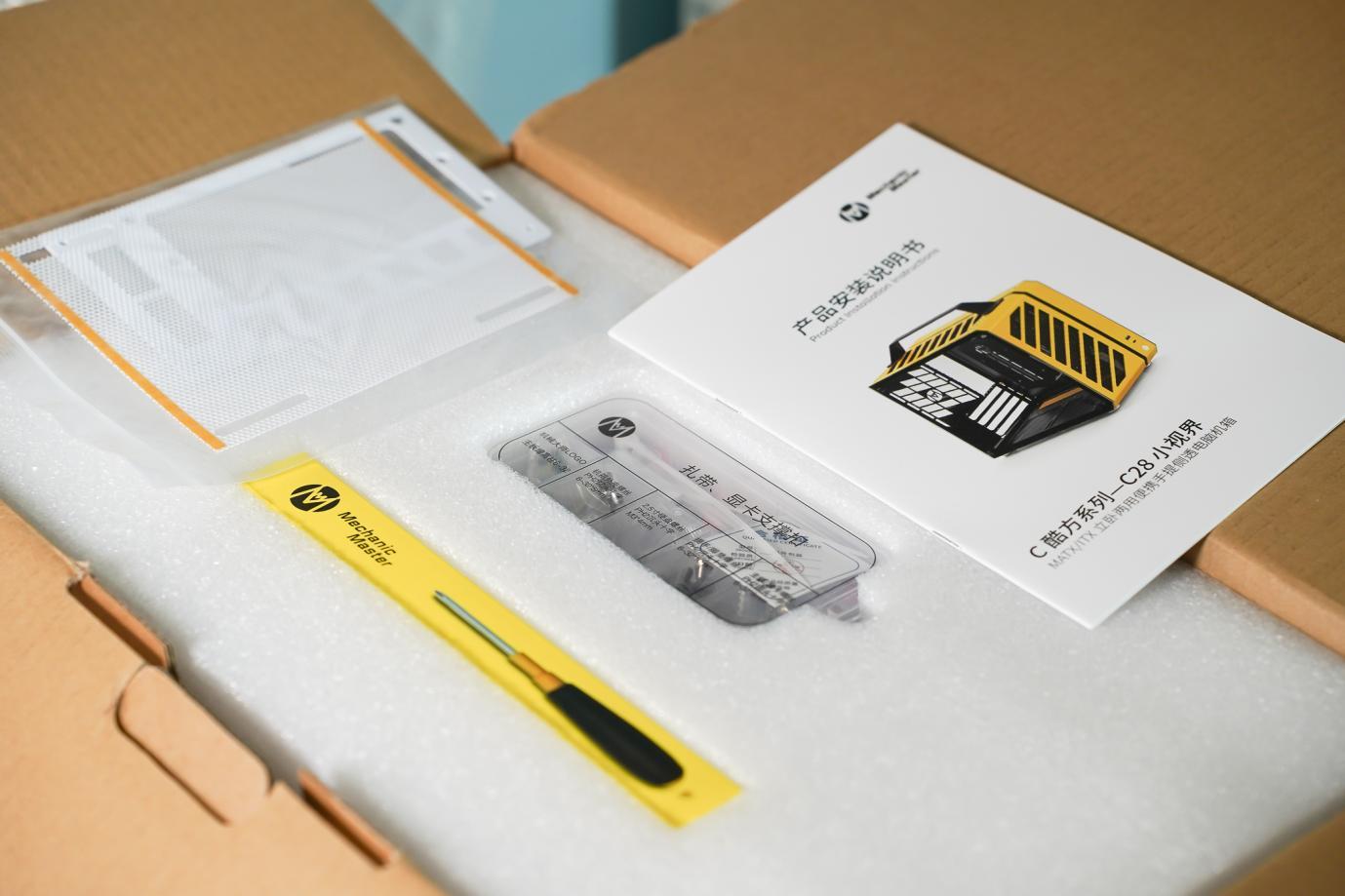 打開箱子,頂部是白色的保護泡沫,中間嵌着一個透明的配件盒和一把螺絲刀盒子。一個白色的小板和磁吸防塵網,一本彩色的說明書靜靜的躺在上面。