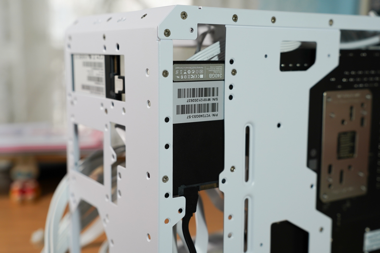 雖然我不用SATA SSD硬盤,但是考慮到也許有人要用,我臨時起意又加了一個SSD硬盤,這下子有增加了些難度。安裝硬盤並不難,難的是增加了一根供電線和數據線,空間需求增加了,理線難度增加了。