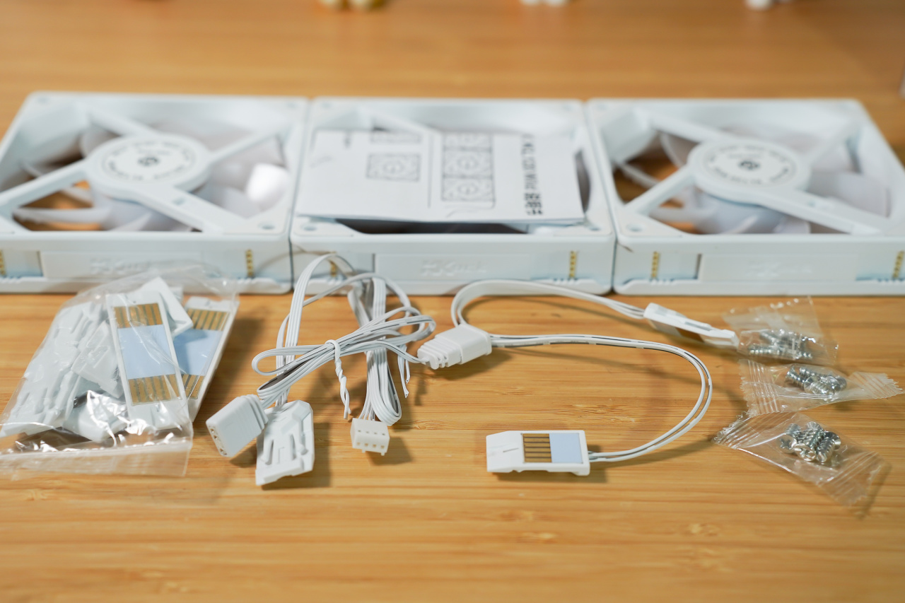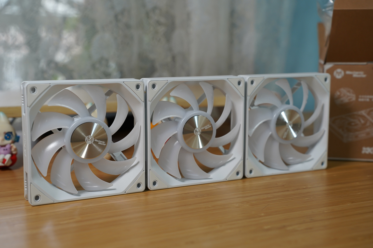 這套風扇一共3個,扇框雙面均有ARGB等效。框架紮實,全卡扣設計,穩固牢靠。它的扇葉採用了仿鯊魚鰭葉片設計,0.8mm風扇間隙,動態液壓軸承、高效噪音低。中間鋁片LOGO加CD螺紋,精緻漂亮。