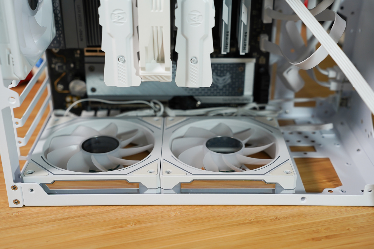 送風也很重要,由於電源前置,前置進風會有所阻礙,所以選擇在底部安裝了2個進風風扇。同時將線也接好。得益於四面的面板均拆下,安裝的過程還是相對順利的,手操作也有足夠的空間。