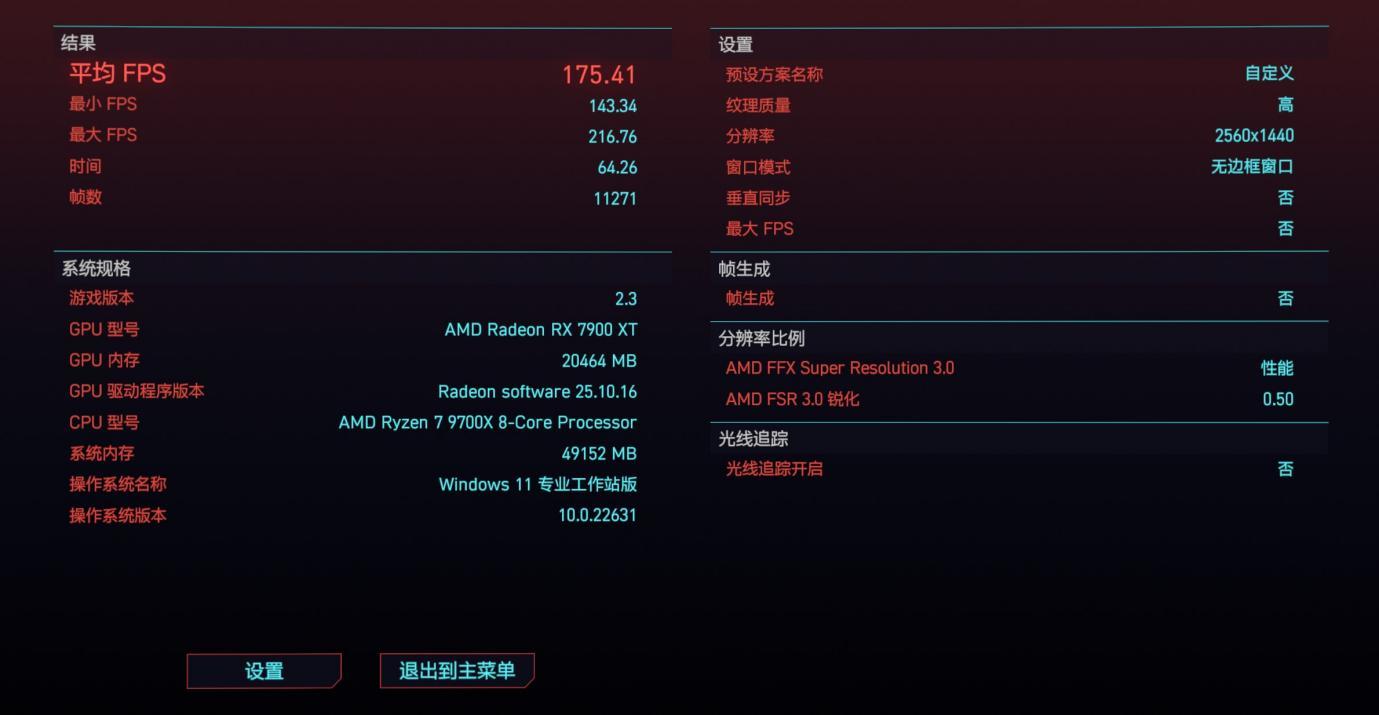 賽博朋克2077 高畫質下開啓FSR 3.0,平均幀數175.4,暢玩沒有問題。