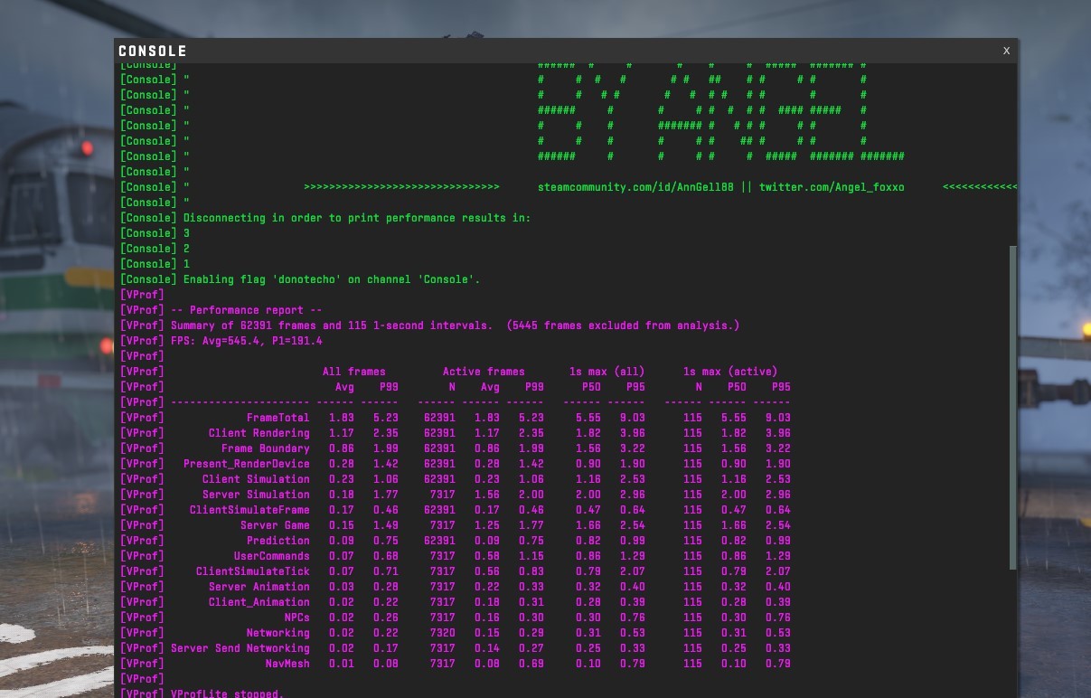 CS2 1080P窗口模式畫質高下測試,平均幀數545.4,1%LOW幀是191.4,表現不錯。