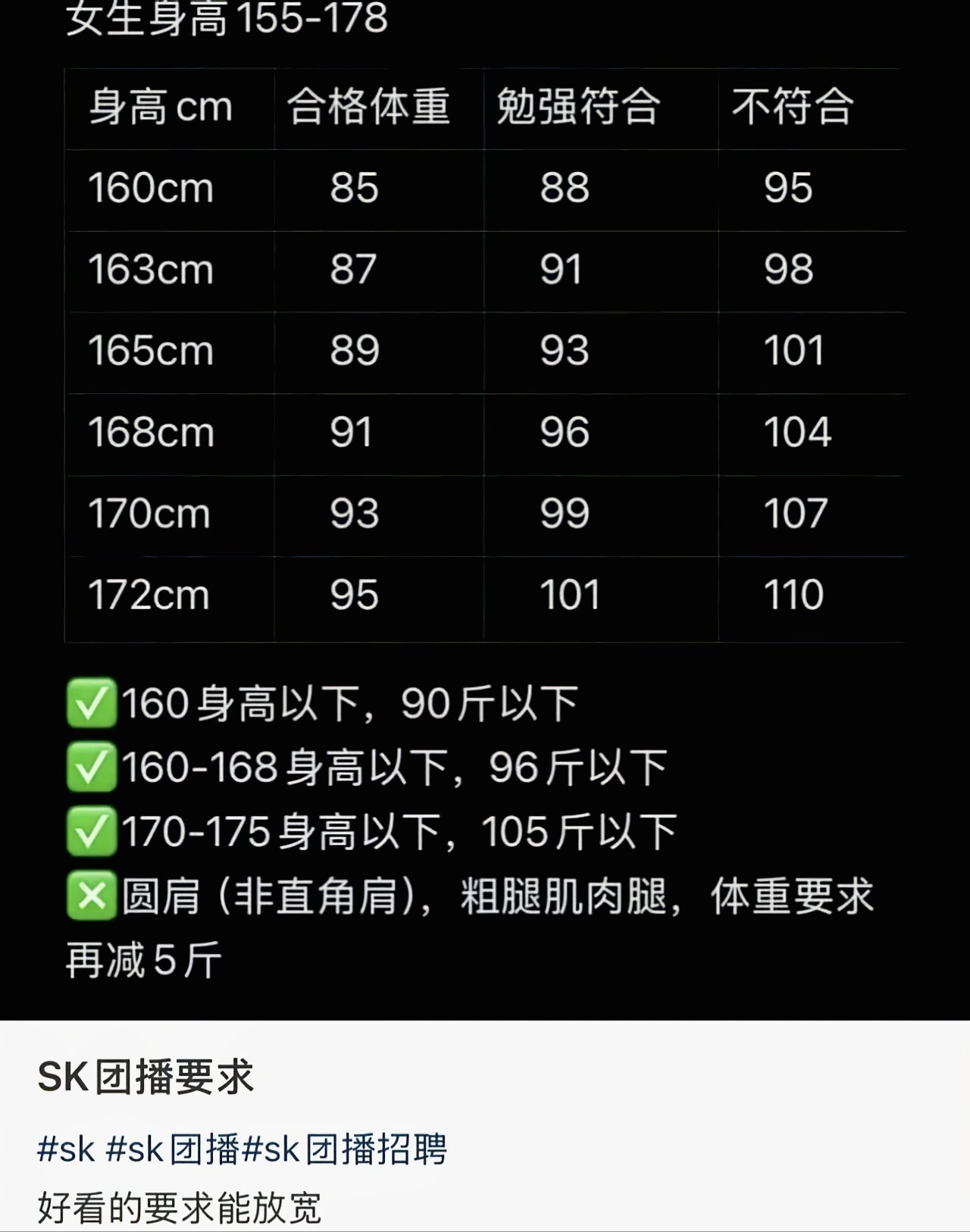 - 身材标准严格(如SK女团要求160cm女生体重不超88斤,超标需减重);