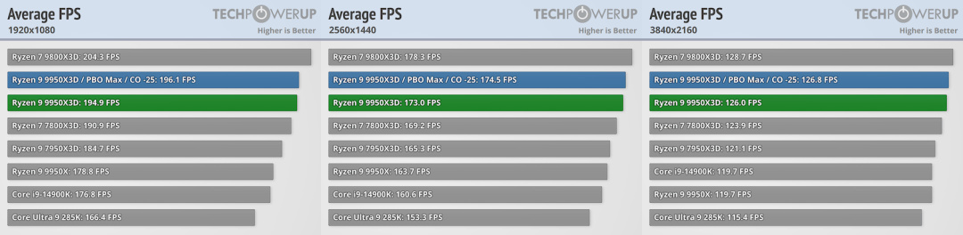 CPU平均帧对比(9950X3D基准)来源:techpowerup