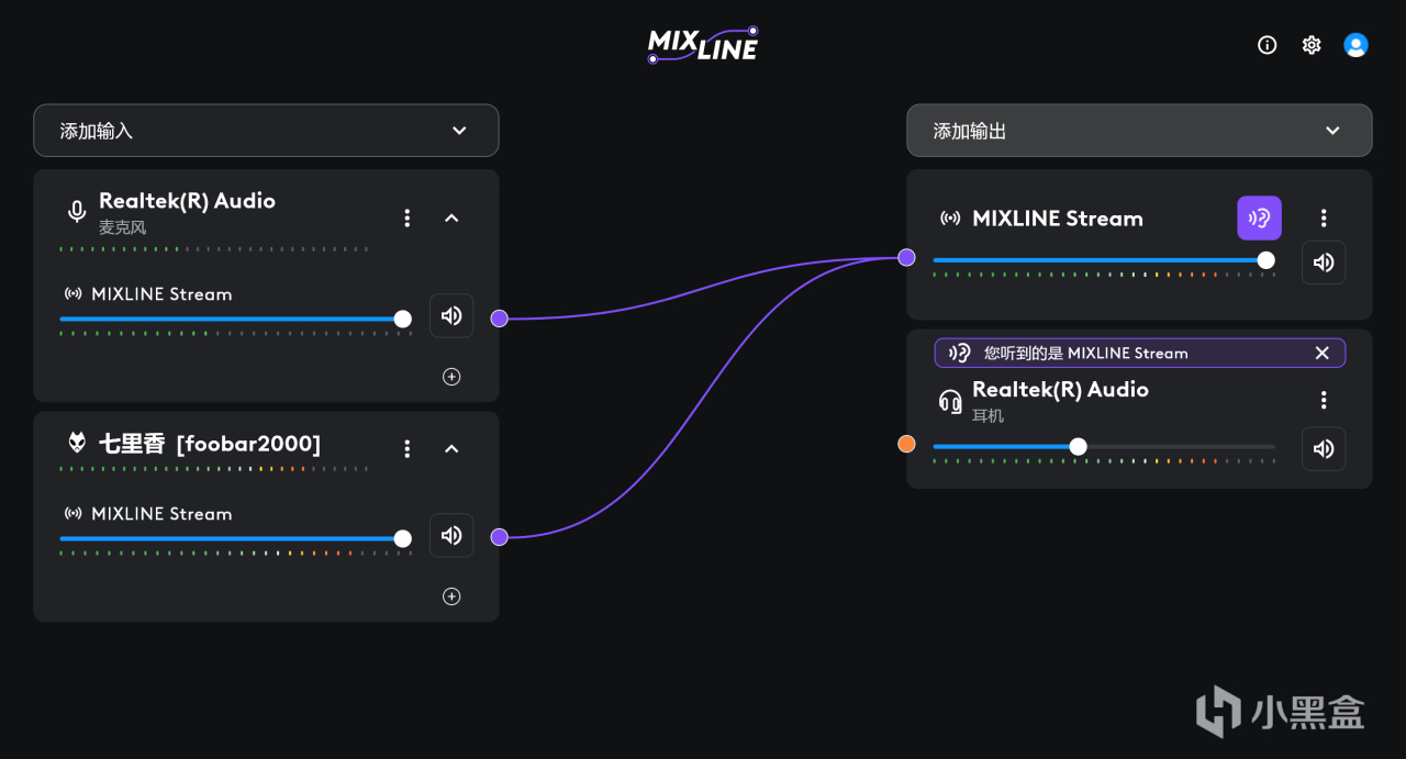 拖拽实体麦克风的➕号连接到MIXLINE Stream(虚拟麦),实体麦的声音就同步到了虚拟麦。