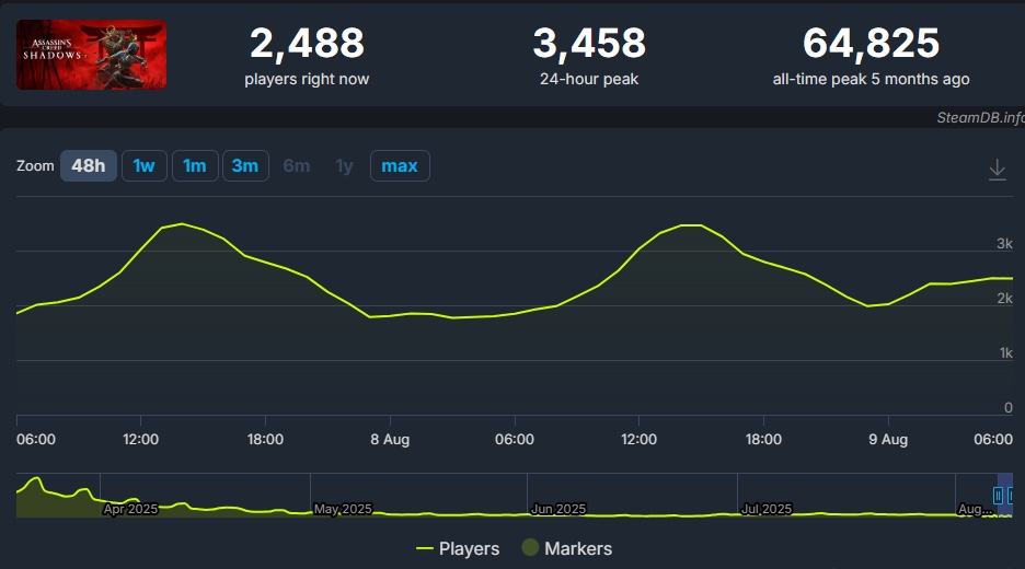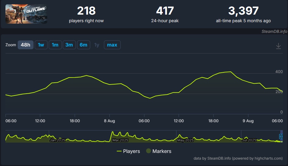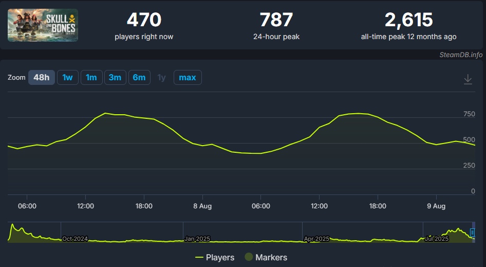 去年上线的《碧海黑帆》《刺客信条:影》和《星球大战:亡命之徒》等核心作品未能获得预期市场反响。其中,《碧海黑帆》据称开发成本高达8.5亿美元,游戏在Steam平台上线后,同时在线玩家峰值仅为470人,后续活跃度持续低迷,长期徘徊在300人左右,远低于同类3A级大作的正常水平。在日本市场,PS5版首周销量仅为6,635份,因其玩法空洞、优化差等问题口碑崩坏,成为拖累公司业绩的重要原因。
