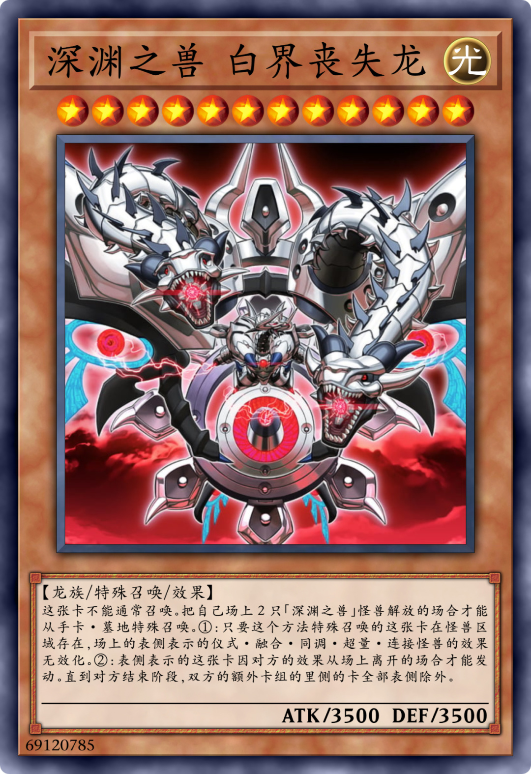 深渊故事里面拥有神之设定的大概就是这只:白界丧失龙。拥有着游戏王现设定下最高等级12星,并且攻击力和守备力的合计值也是7000点。