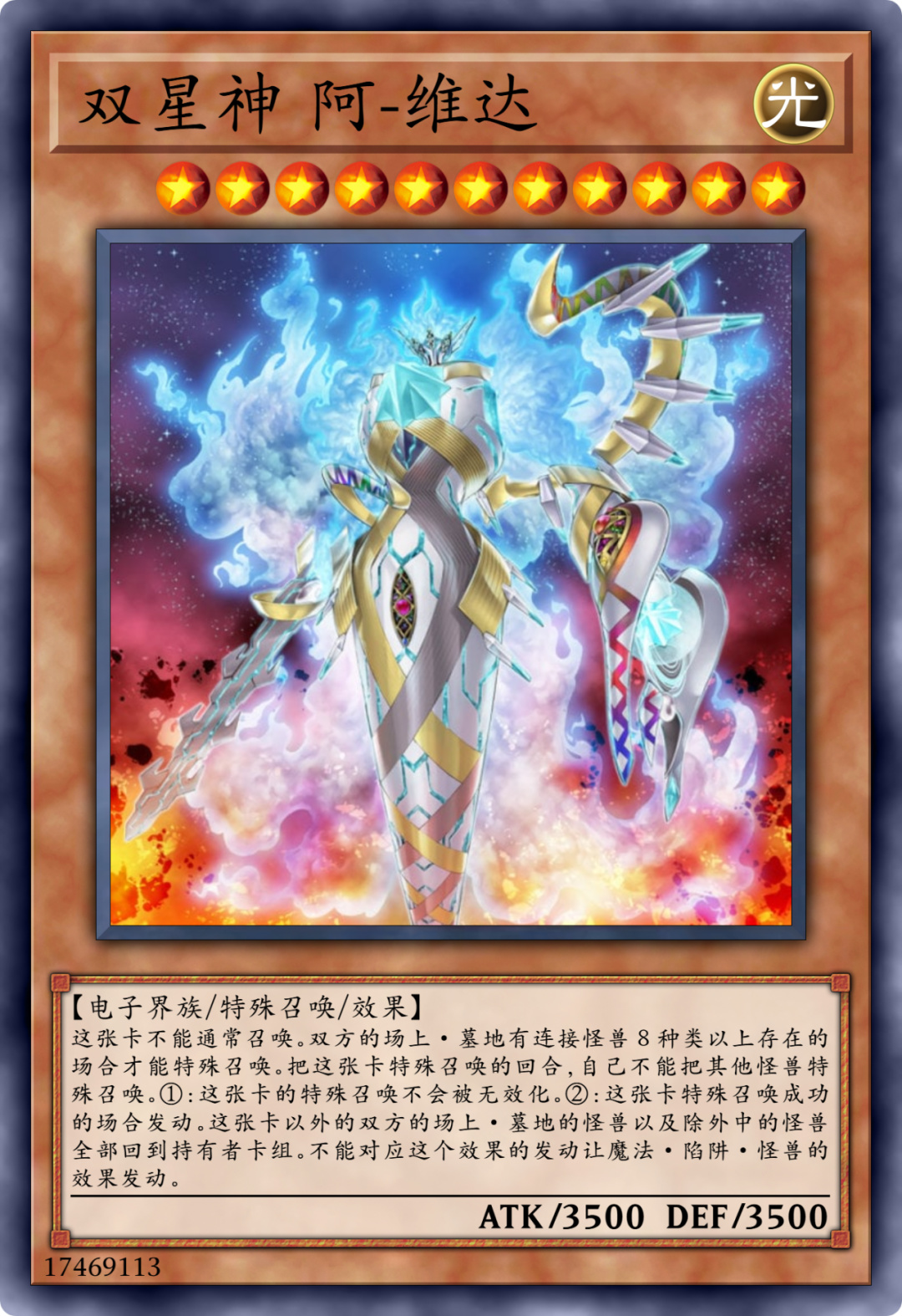 双星神从卡牌效果上来看依然延续了索菲娅和提耶拉的设定,并且攻击力和守备力都为3500点,合计7000点。