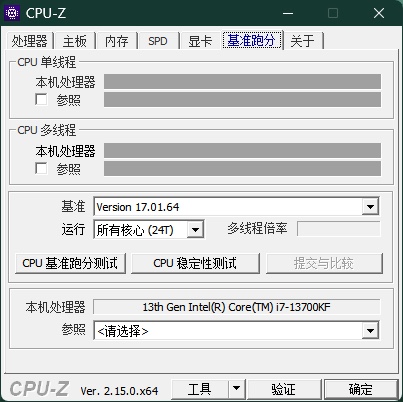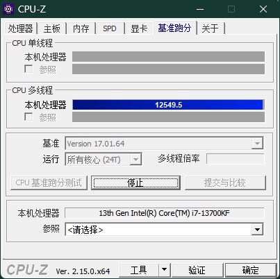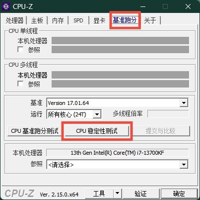 先在CPU-Z这个软件点击基准跑分再点击CPU稳定测试,电脑风扇会呼呼响