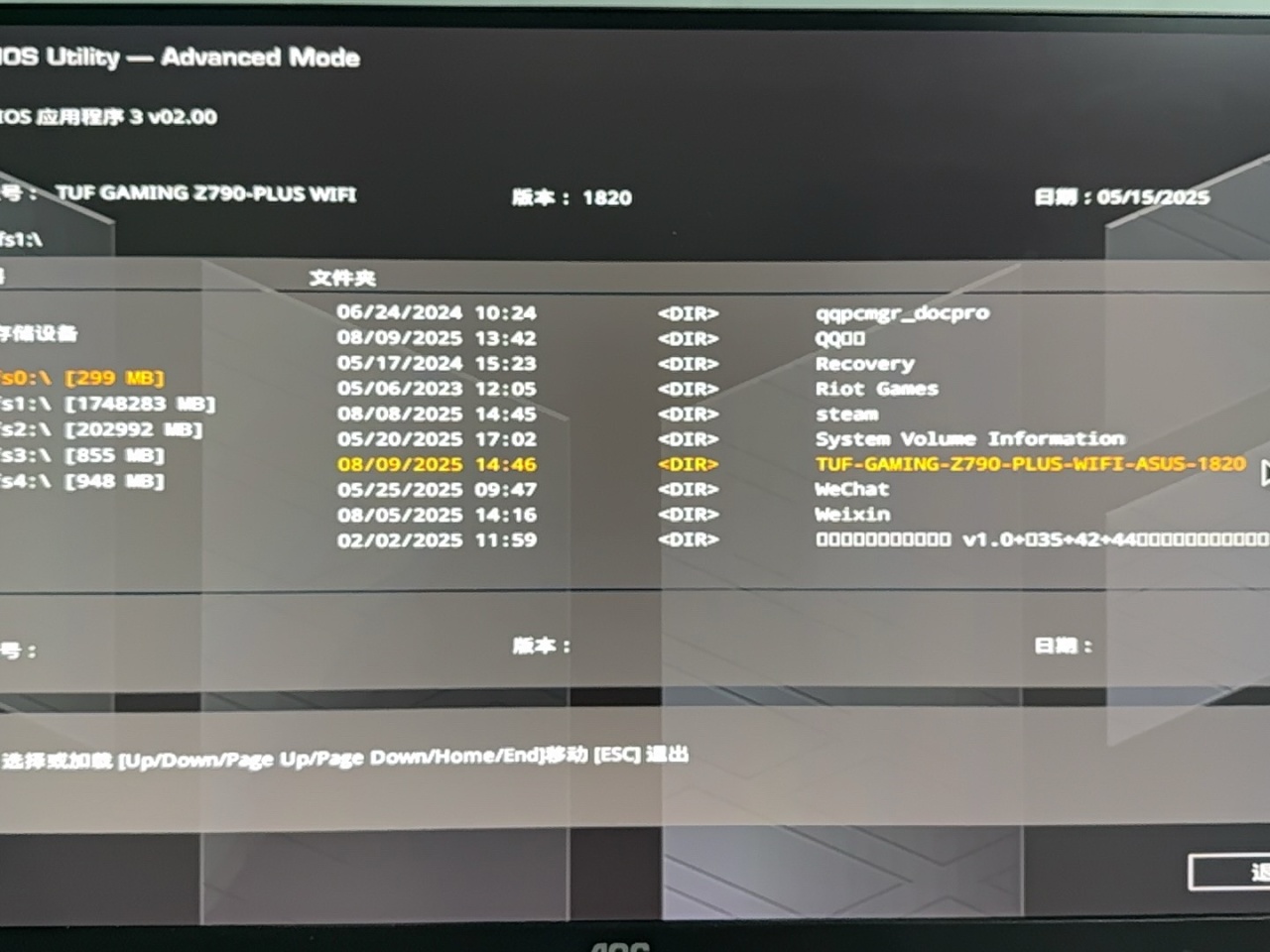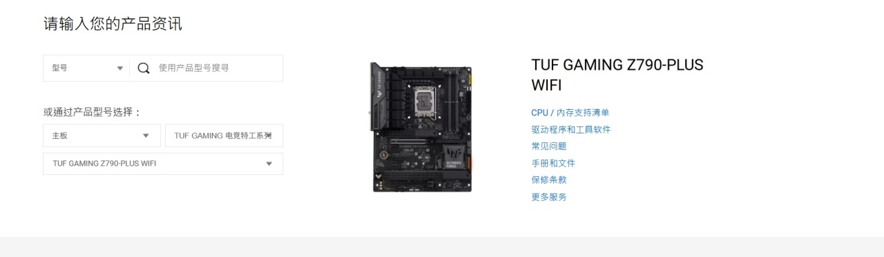 选择产品类型和型号,我的型号是TUF GAMING Z790-PLUS WI-FI,注意了‼ 有的主板是分ddr4和ddr5的,ddr4的主板后面会有后缀D4,D5主板后面没有后缀,别下载错bios文件了,不然会导致变砖