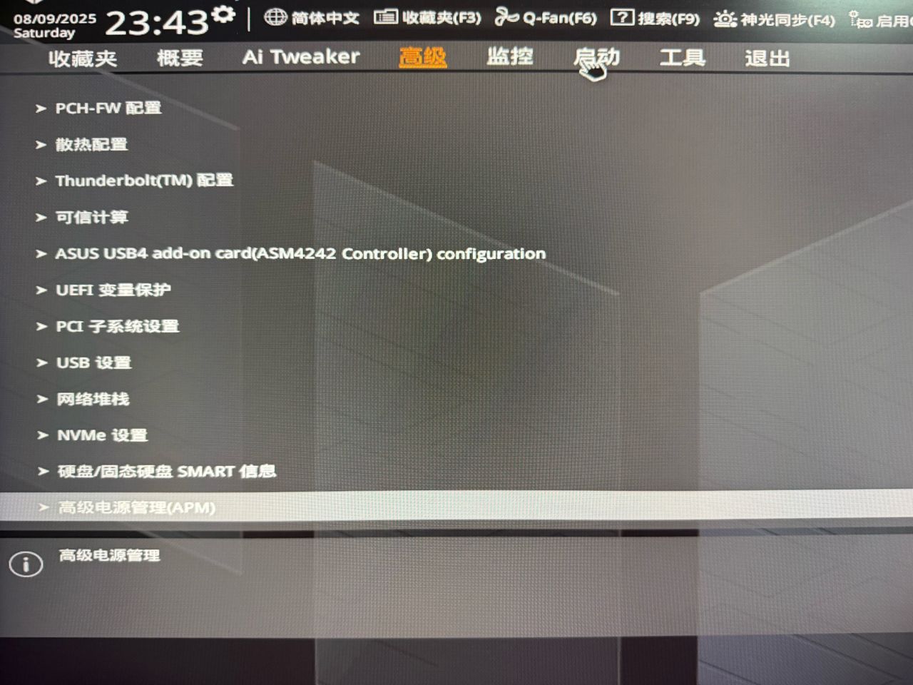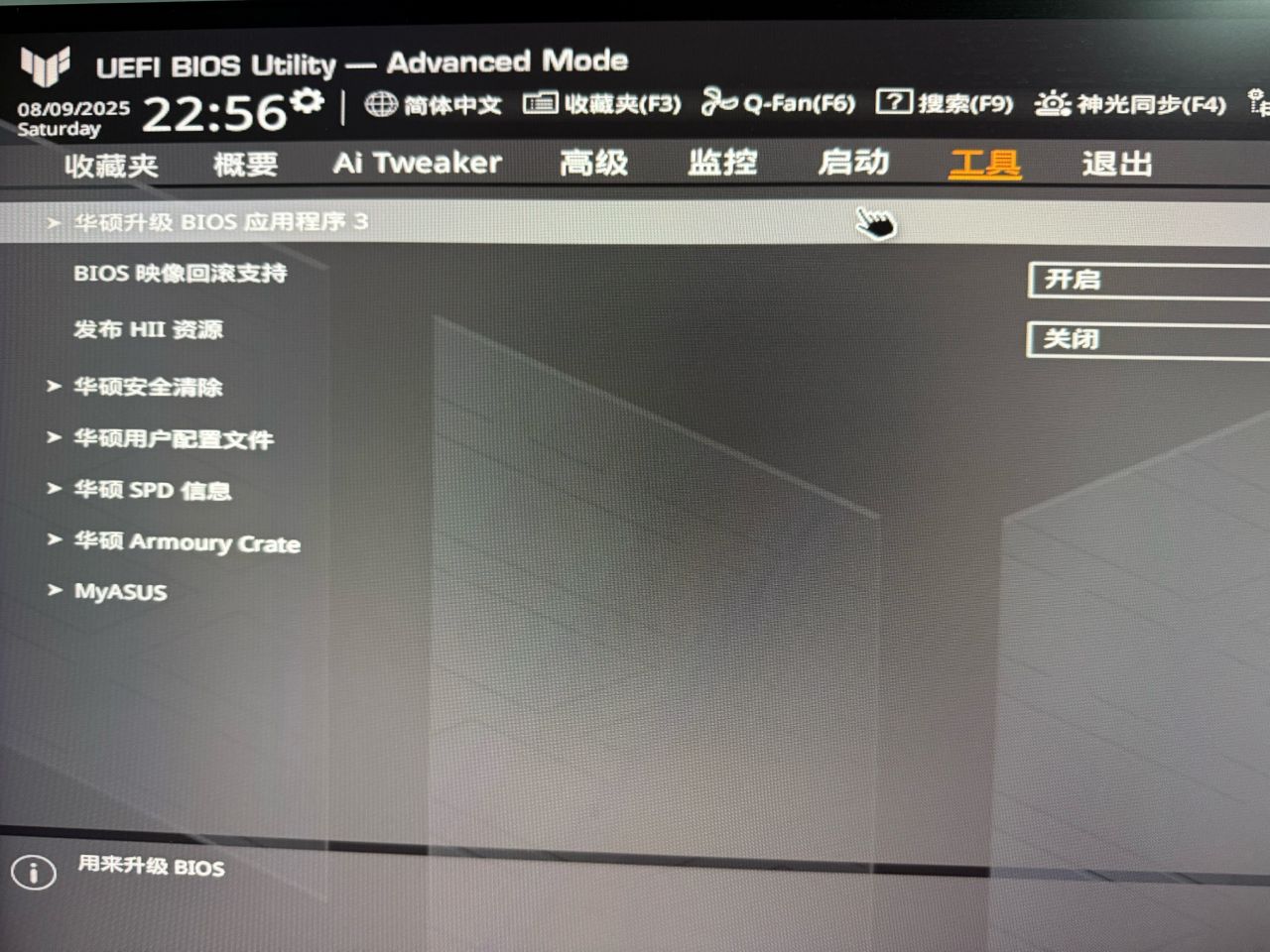 然后直接重启电脑,进入bios界面,我的华硕主板按F2或者Del就行,其他品牌主板我不太了解,进入之后按F7进入高级模式➡工具➡华硕升级bios应用程序