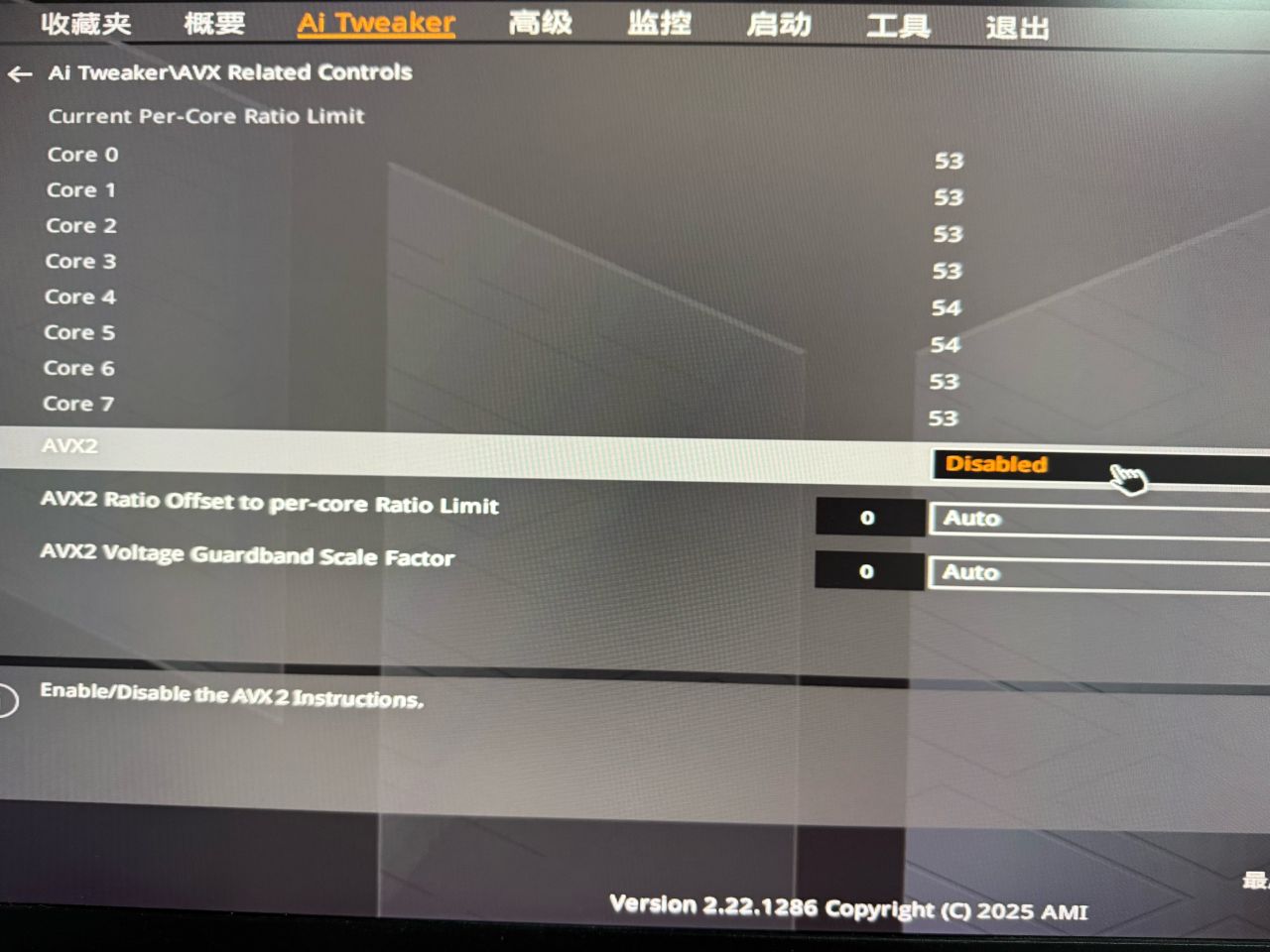 还是在bios界面F7高级模式,选择Ai Tweaker,选择AVX Related Controls