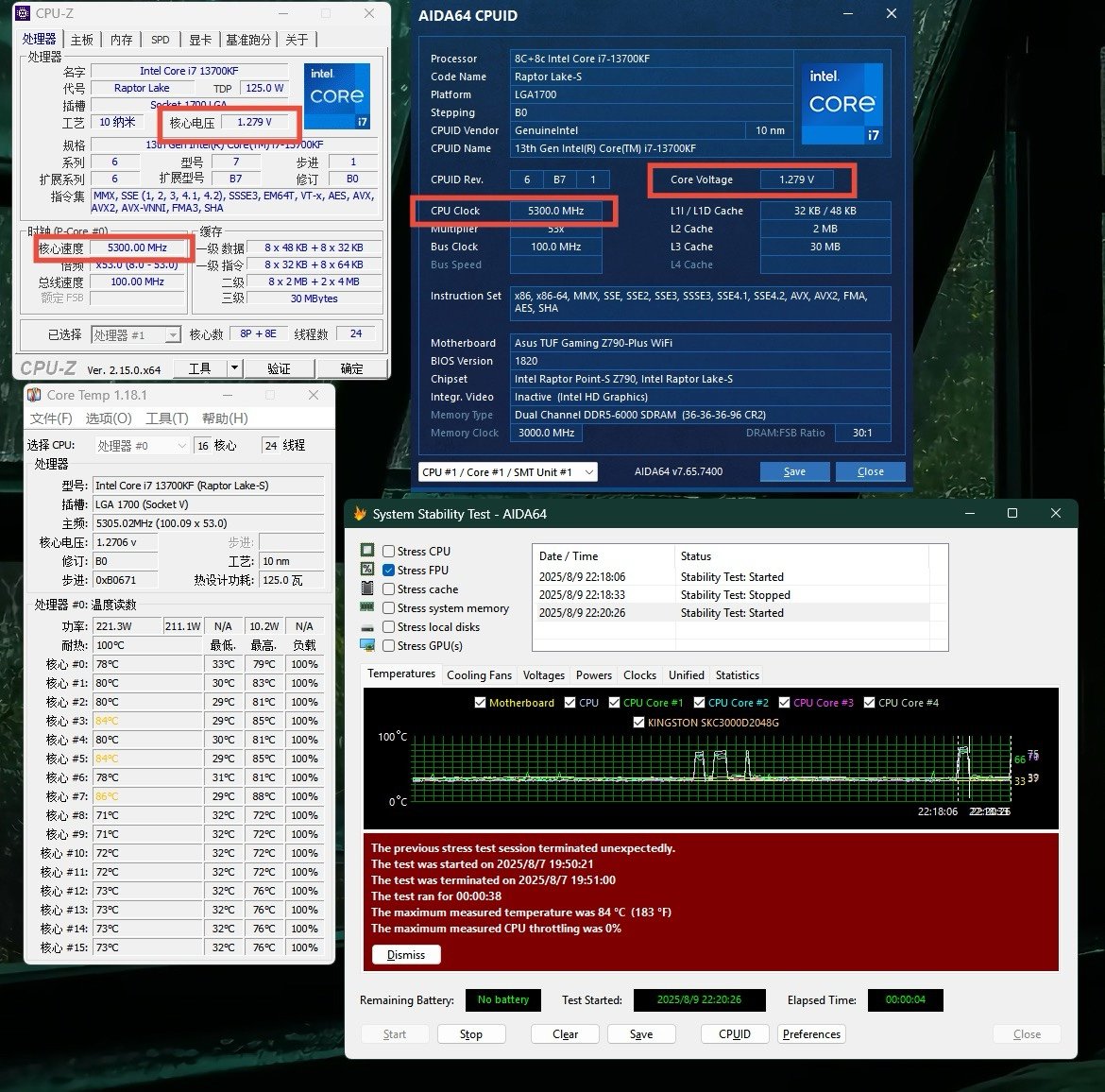 然后这个时候测试就结束了,相信大部分人都多多少少有睿频不稳定,电压高温度高的情况,下面我们就开始操作。