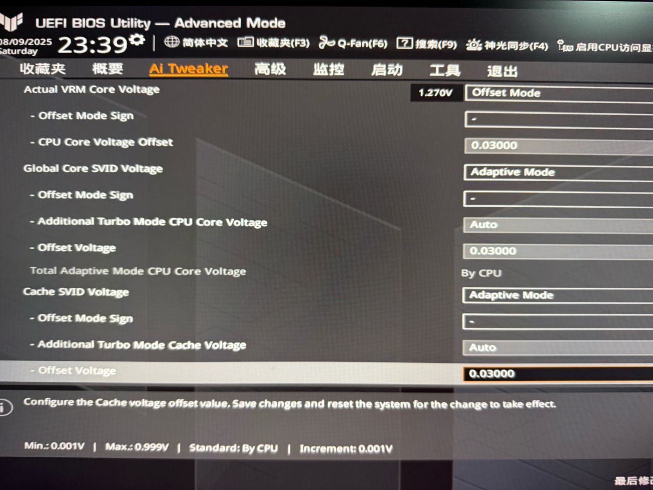 下面的Cache SVID Voltage也是选择这个Adaptive Mode,下面的也是设置成-号,在Offset Voltage这一栏也是建议从0.01开始调。 注意‼一共有三个数值,这三个数值必须是一样的,你们可以参考一下我的设置。
