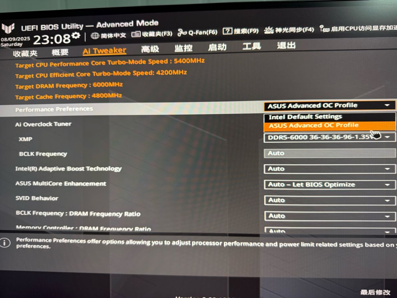 按F7进入高级模式,点AI Tweaker,选择这个Performance preferences选择ASUS Advanced OC Profile