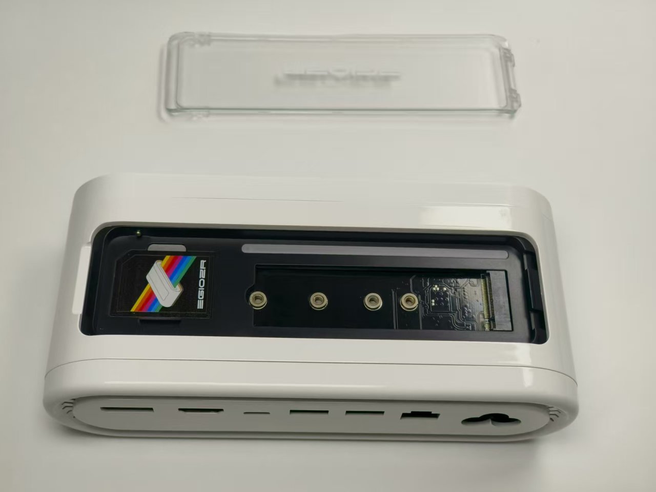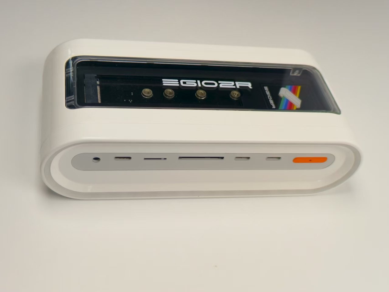 先来聊一下外观,与传统的暗色调扩展坞不同,这款扩展坞整体以白色配色为主,并且外观形状类似一个椭圆柱形,正面是可拆卸式的透明外壳,你可以很轻松的将外壳拆卸,并且在内部插入固态硬盘,与我们常见的移动固态硬盘盒不同,由于这款产品主要用途还是当作扩展坞来使用,因此它相当于让你的电脑多了一个固态硬盘槽,这对于原本电脑硬盘槽不足或者需要长期外接额外固态硬盘的人来说简直是如有神助。