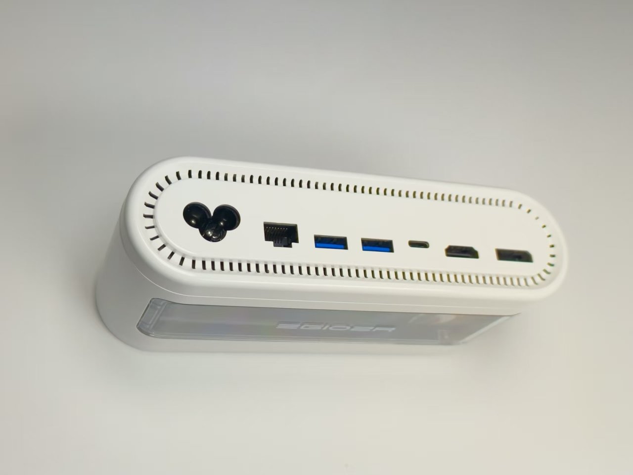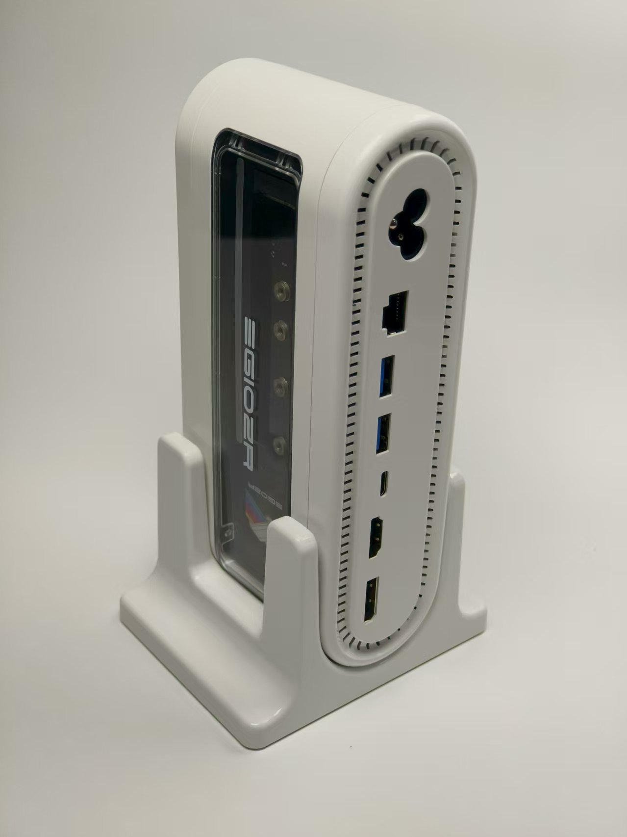 产品的插口设计也很有讲究,诸如typeC、SD卡插槽、3.5mm耳机接口这种接口较小并且可能需要来回插拔使用的都放在了最前面,并且在周围加上了一根支持七种颜色自由切换的RGB灯条,使其更符合桌搭爱好者的审美。而像HDMI、USB接口以及网口等较大并且平常不轻易插拔的接口都放在了后面,考虑到桌面以及需求不同,你既可以通过立式支架将其立起来放置,也可以利用其附赠的硅胶片来横版放置,至于什么放置习惯完全取决于你自己,就这外观,可太磕我们桌搭爱好者的心了。