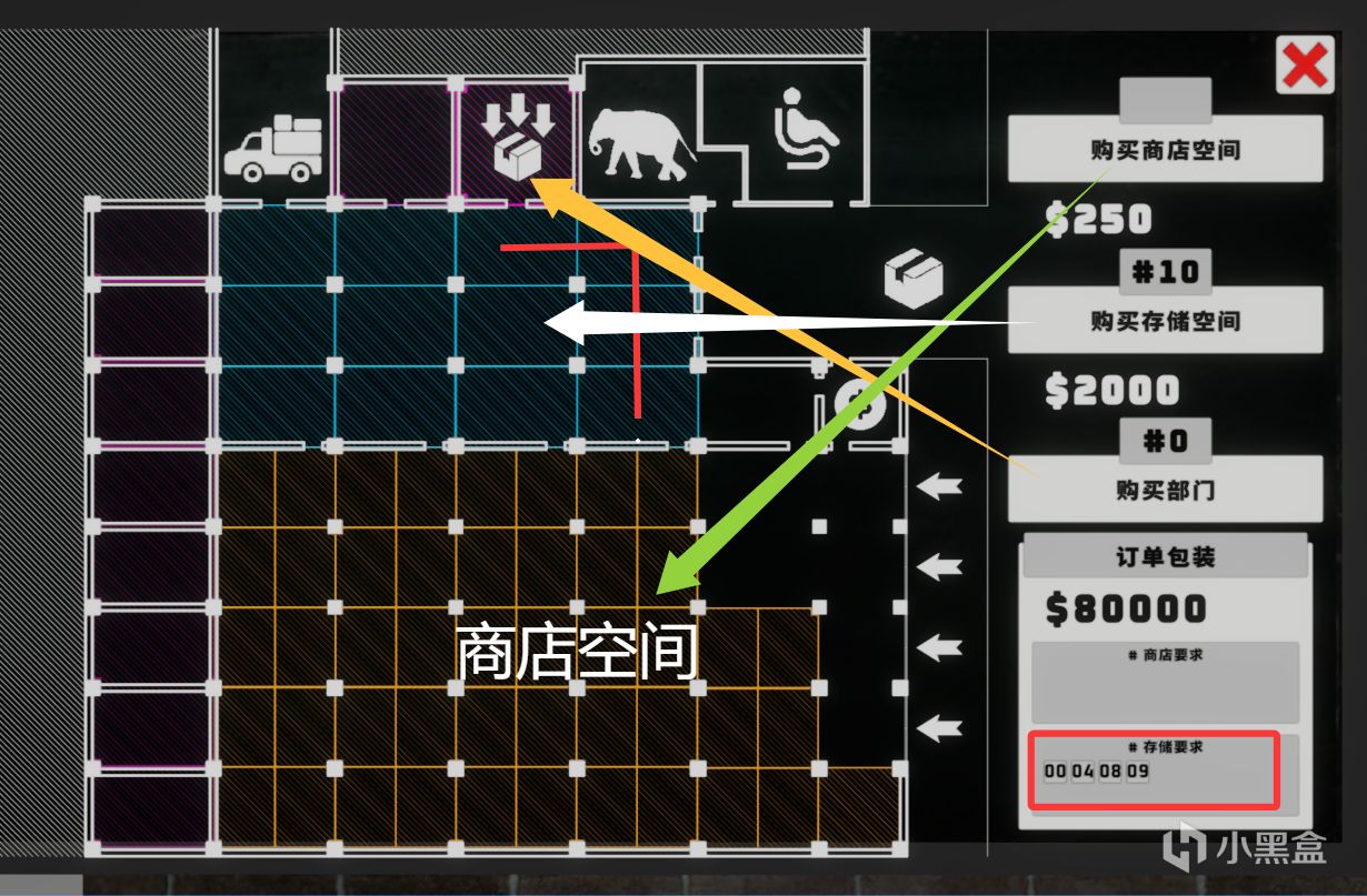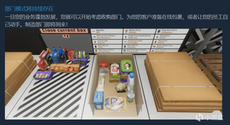 产品订单页:左边是解锁的产品品类,右下角有一个小加号可以将当前页面全部加到购物车。左下角是购买空箱子(样式随机,这个员工也扔,放货车上就不会扔了hhh)