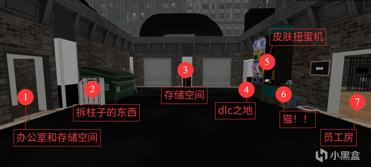 右上角是员工休息室,大象是dlc,部门需要解锁我红线画的那几个地皮,左上角那个未来可期。