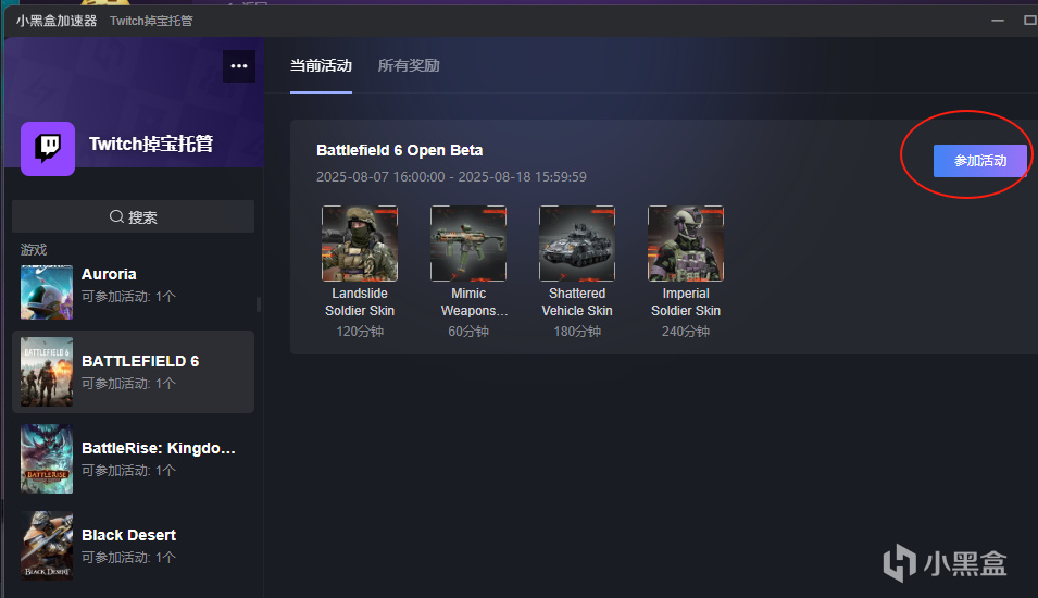 綁定完成後回到小黑盒加速器的掉寶工具,找到《戰地 6》掉寶欄目,再點擊參加,就可以一鍵託管啦!而且還可以排隊別的遊戲掉寶活動哦,非常方便!