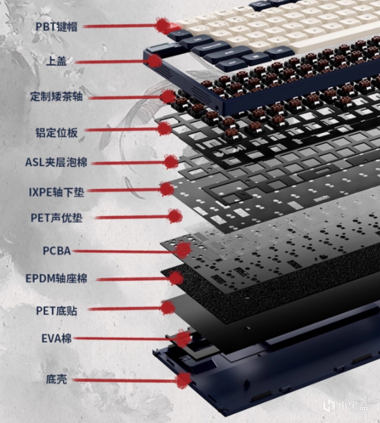 別看畢方雖然薄薄的一塊,但是內部填充上絲毫不含糊,定位板方面採用了鋁製,鋁製的硬度更強一些,同時敲擊聲音也更清脆,而下方用了泡棉+軸下墊+PET+軸座棉+EVA棉五層填充,再加上整體的gasket結構,整體的手感和一致性方面都大大提升,聲音方面就清脆好聽更多。