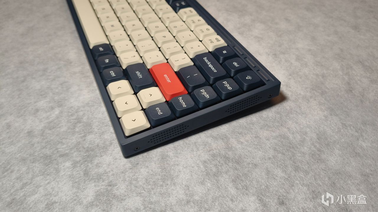 首先是外觀方面,整體配色和SKN備受歡迎的青龍一致,分爲雷和電兩款配色,圖爲電配色,藏青色+米色紅色鍵帽混搭起來非常耐看,鍵盤採用了84鍵位佈局,非常緊湊不佔桌面空間。